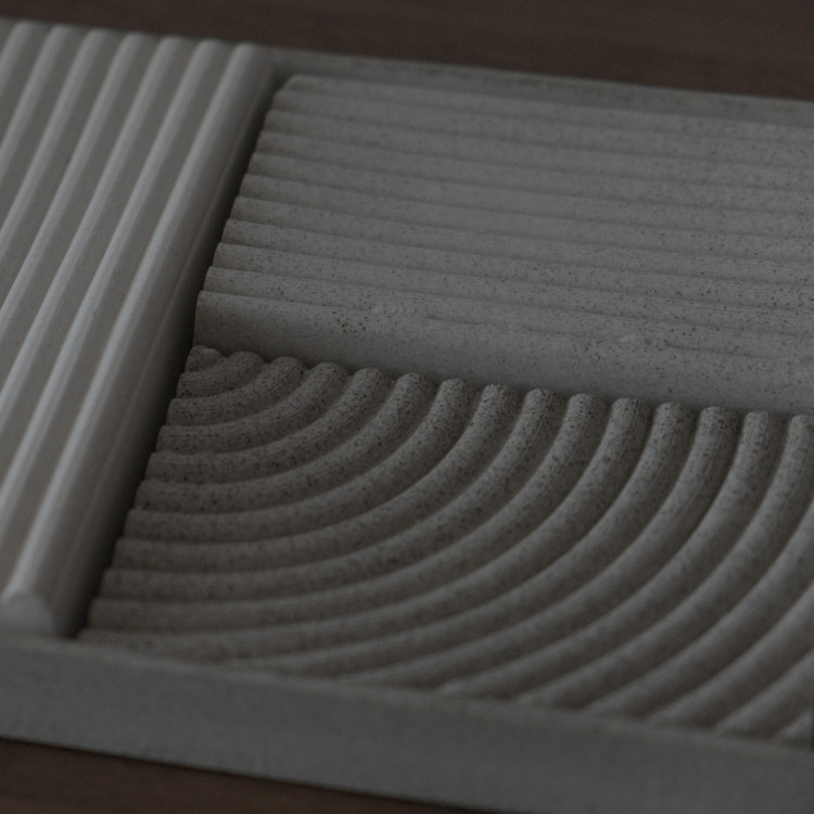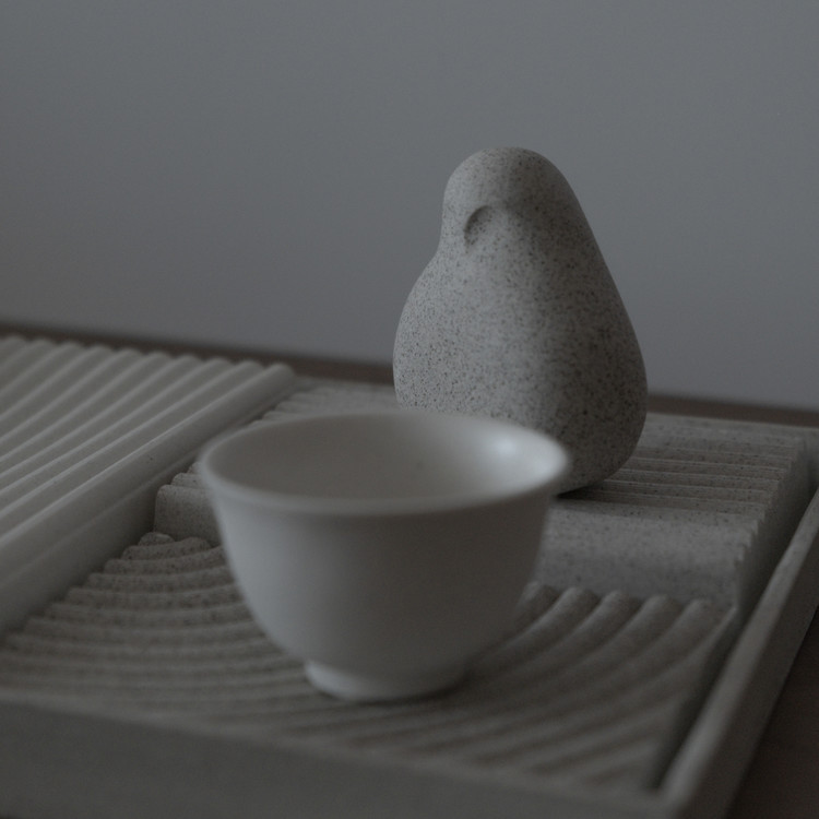 교토의 모래돌정원(젠가든)을 닮은 다판과 부엉이 다우, 작은 찻잔으로 이루어진 1인 티세트입니다. 물결을 모티브로 모래 위에 요철을 내어 만든 젠가든에서 영감을 받아 보다 명상적인 찻자리를 위해 만들어졌습니다.