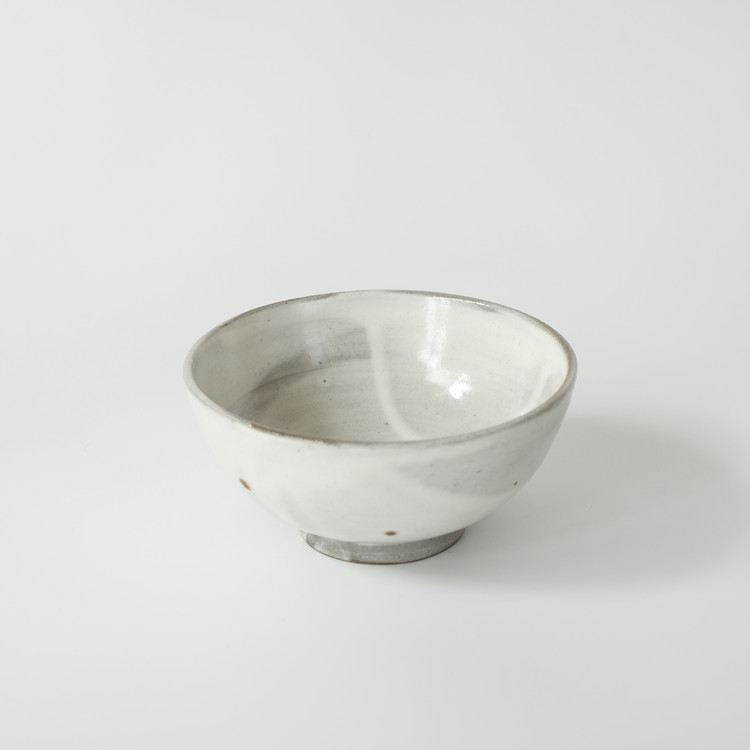 표면에 백토를 씌워 장식하는 덤벙 기법을 사용한 보울입니다. 덤벙 기법은 그릇의 굽을 잡아 거꾸로 들고 백토를 탄 물에 담갔다가 들어내는 제작 방식으로, 기물 하나하나 다른 화장토의 기분을 느낄 수 있습니다.