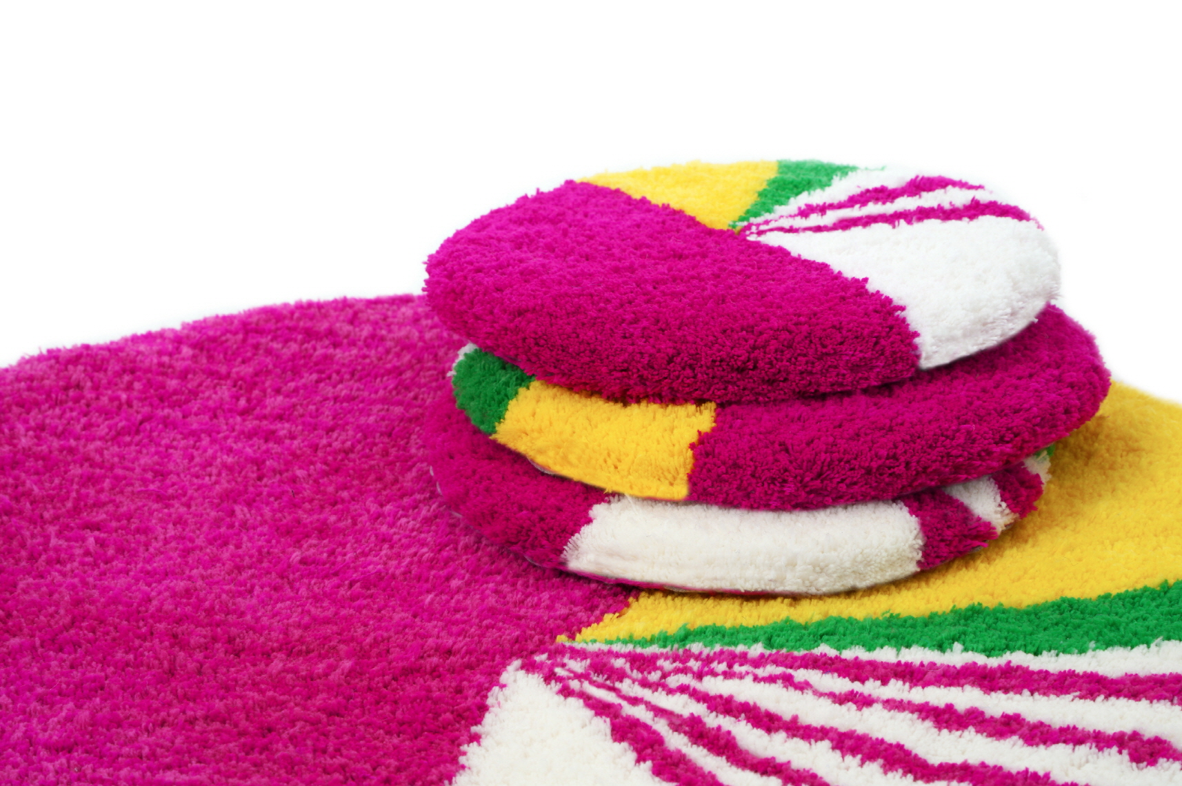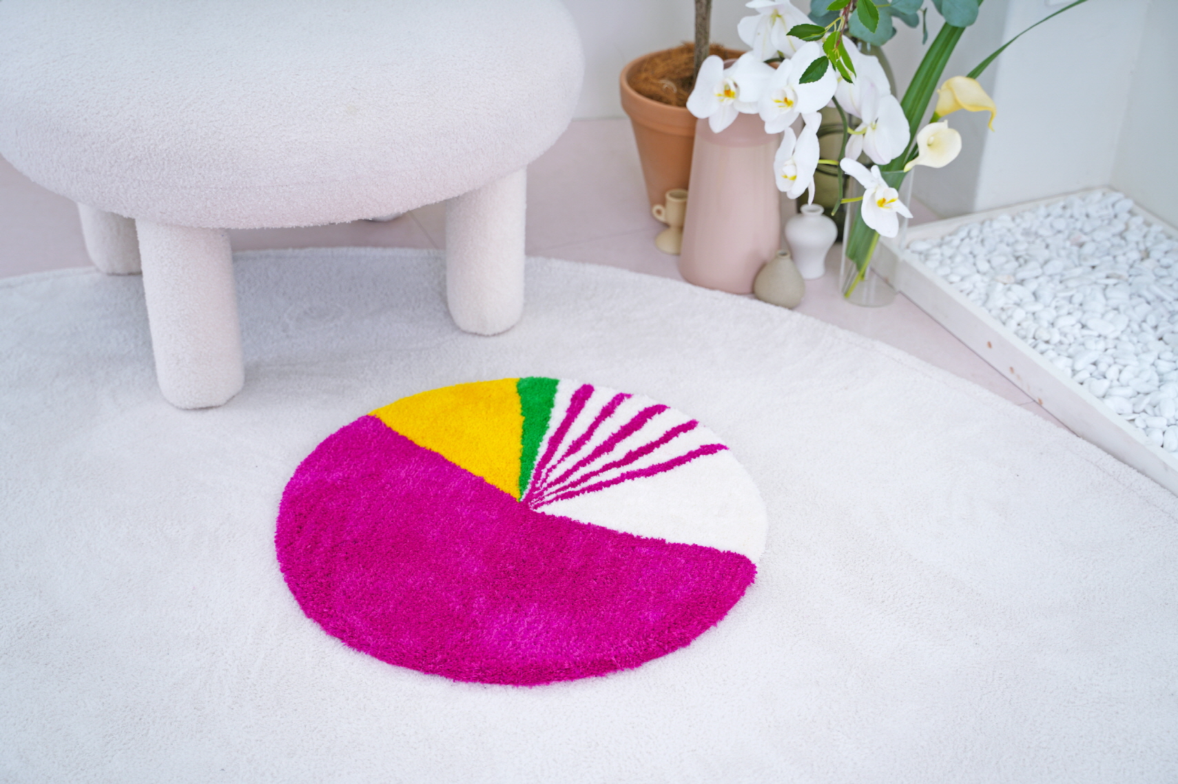 옥춘에서 모티브를 얻어 디자인한 <옥춘 러그>는 일상생활 속에서도 활용도 높게 사용 가능하도록 터프팅 전용 원사 및 손바느질로 제작되어 세탁기 사용과 건조기 사용이 가능한 작품입니다. 원화의 느낌을 작가만의 감성으로 재구성해 멀게 만 느껴졌던 한국의 전통을 일상에서 편하게 경험할 수 있도록 했습니다. 모든 작품은 손단비 섬유공예작가가 핸드터프팅과 손바느질을 이용하여 제작하였습니다.