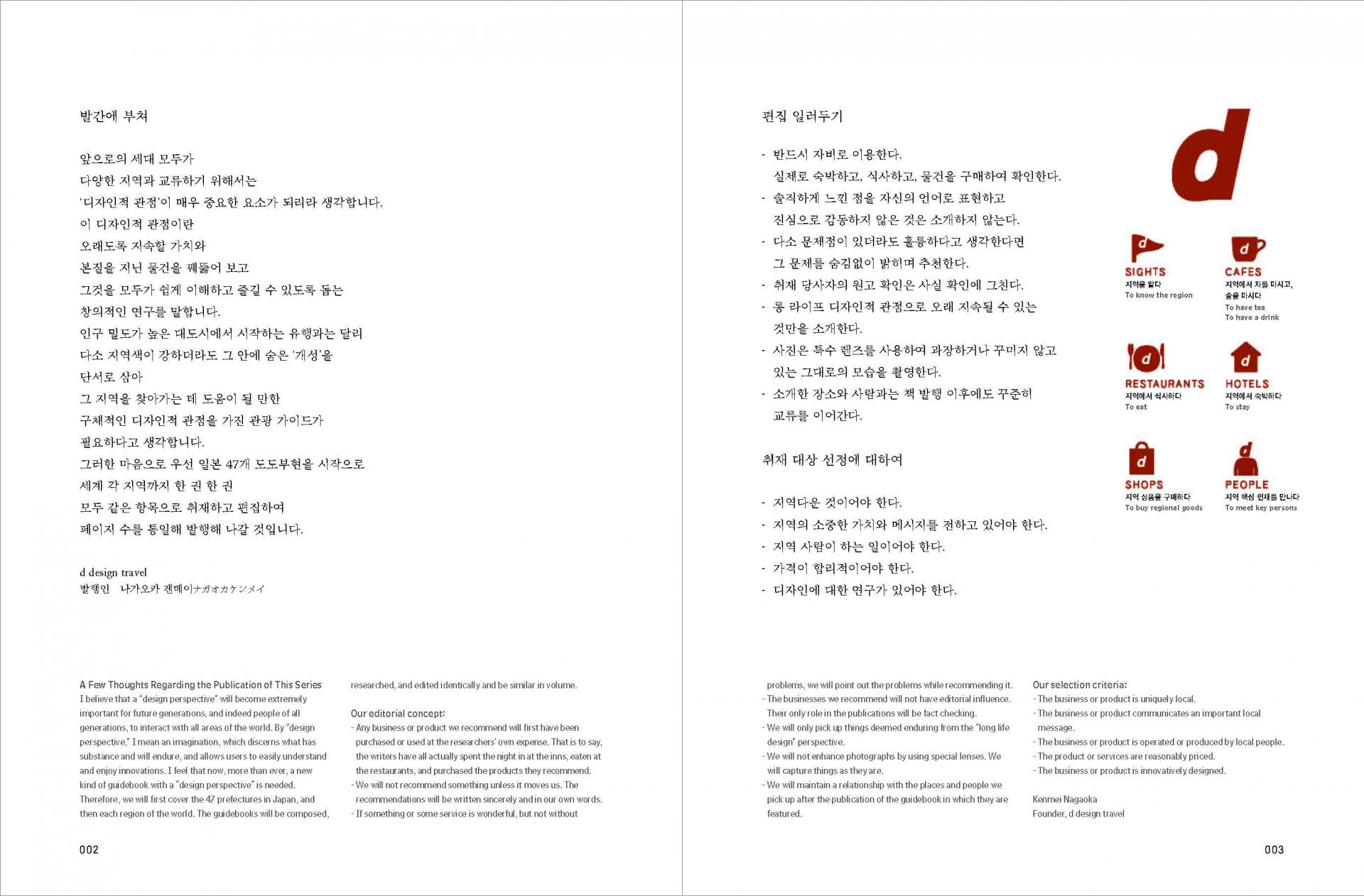 2009년부터 현재까지 총 33지역을 한 곳씩 소개해온 디 디자인 트래블은 일본어와 영어가 병기된 가이드로, 한국 의 독자들을 위한 첫 국문판인 『d design travel KYOTO』와 『d design travel KANAGAWA』 그리고 첫 해외 특집호인 『d design travel JEJU』까지. 앞으로 발행될 디 디자인 트래블 시리즈의 국문판은 디앤디파트먼트 프로 젝트의 지역 파트너이자 첫 해외 지점인 서울점을 운영하고 있는 밀리미터밀리그람MILLIMETER MILLIGRAM 에서 번역·발간합니다.