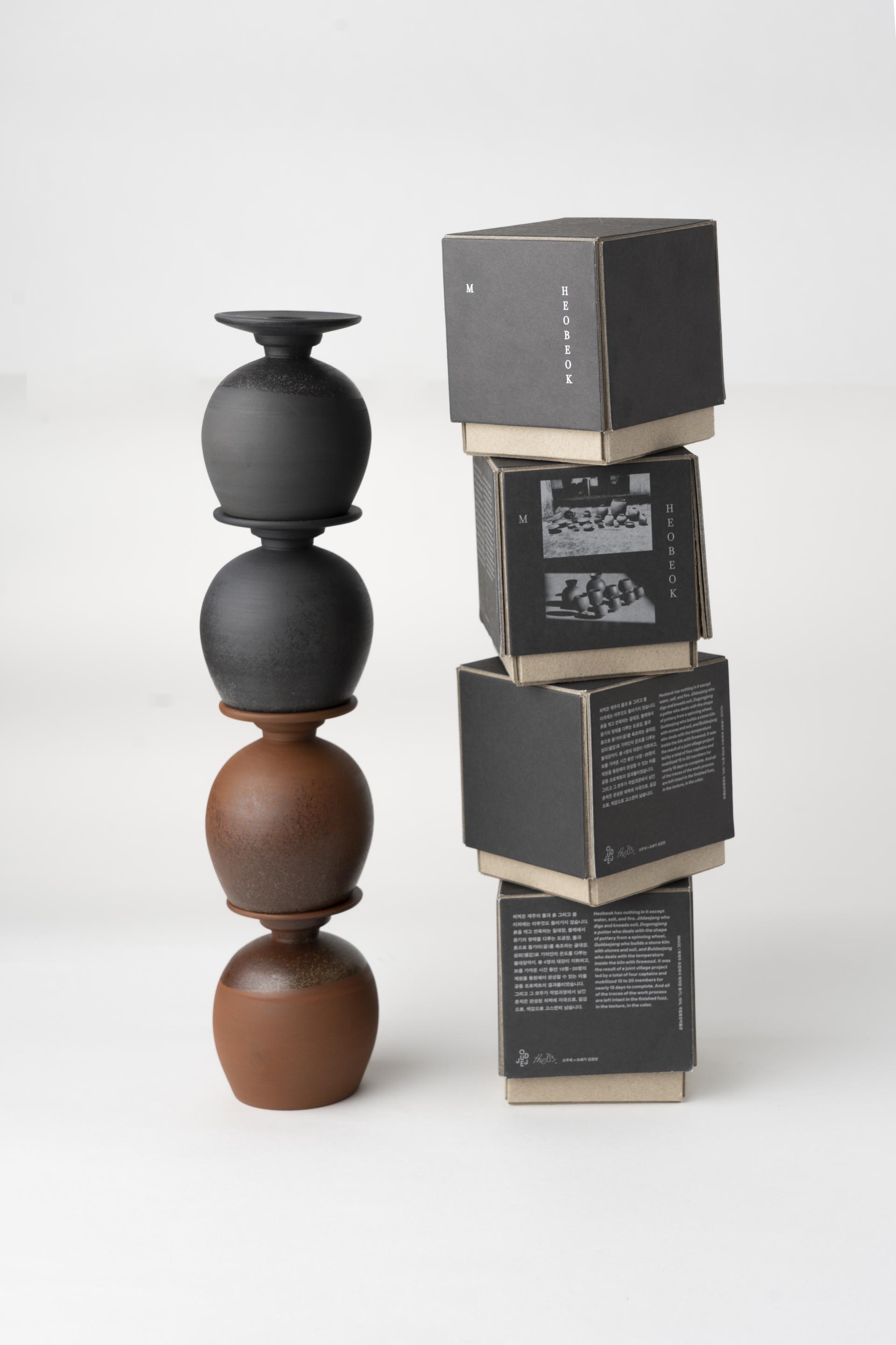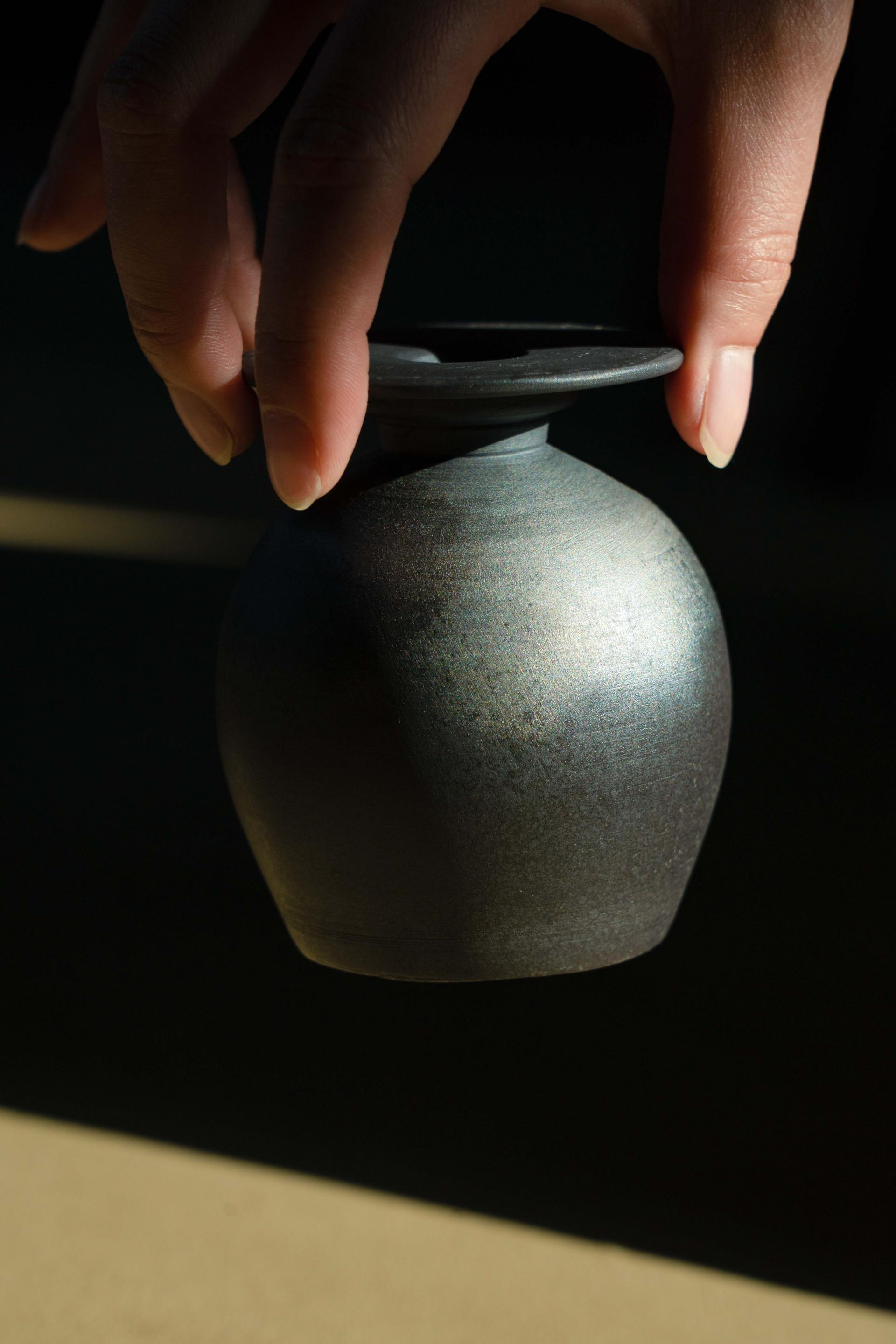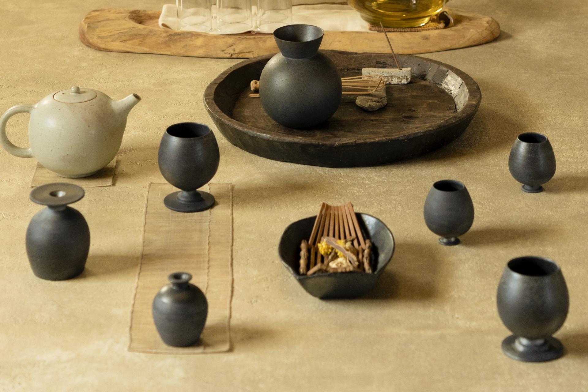 검은 허벅은 제주의 ‘검은굴’이라 불리는 돌가마에서 구워낸 지새 허벅을 모티브로 제작한 잔입니다. 화산회토로 빚어진 허벅이 가마에서 구워지는 동안의 시간이 이 작은 잔에 고스란히 담겨 있습니다. 검은 허벅의 푸른 빛은 화산회토가 뜨거운 불에 반응해 만들어낸 불의 흐름입니다. 두 가지 패턴은 켜켜이 쌓은 채로 구워내는 가마의 형태에서 비롯됩니다.