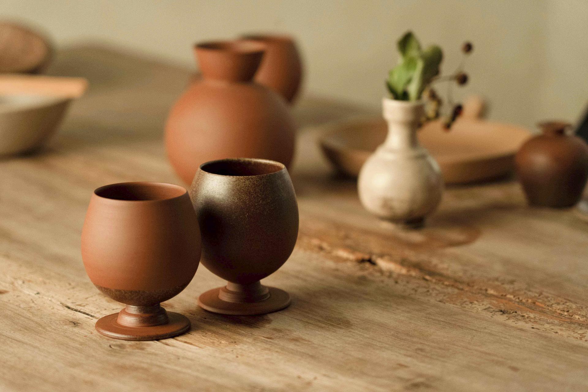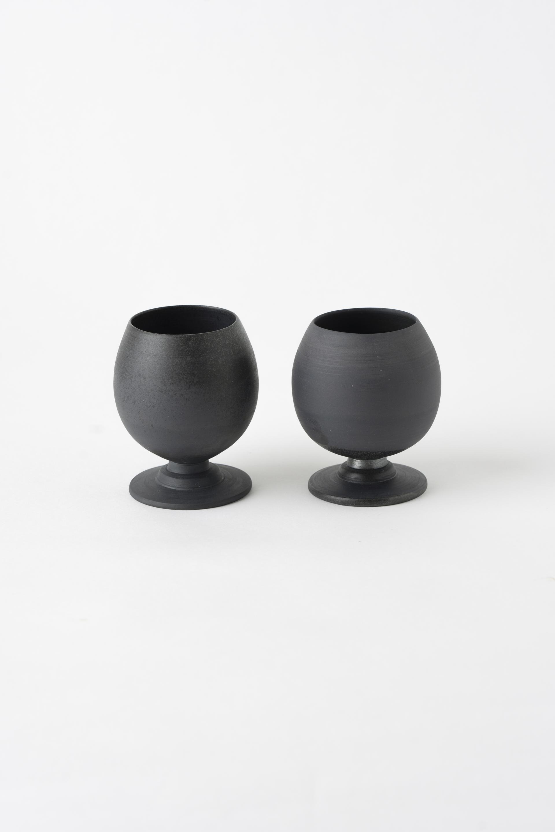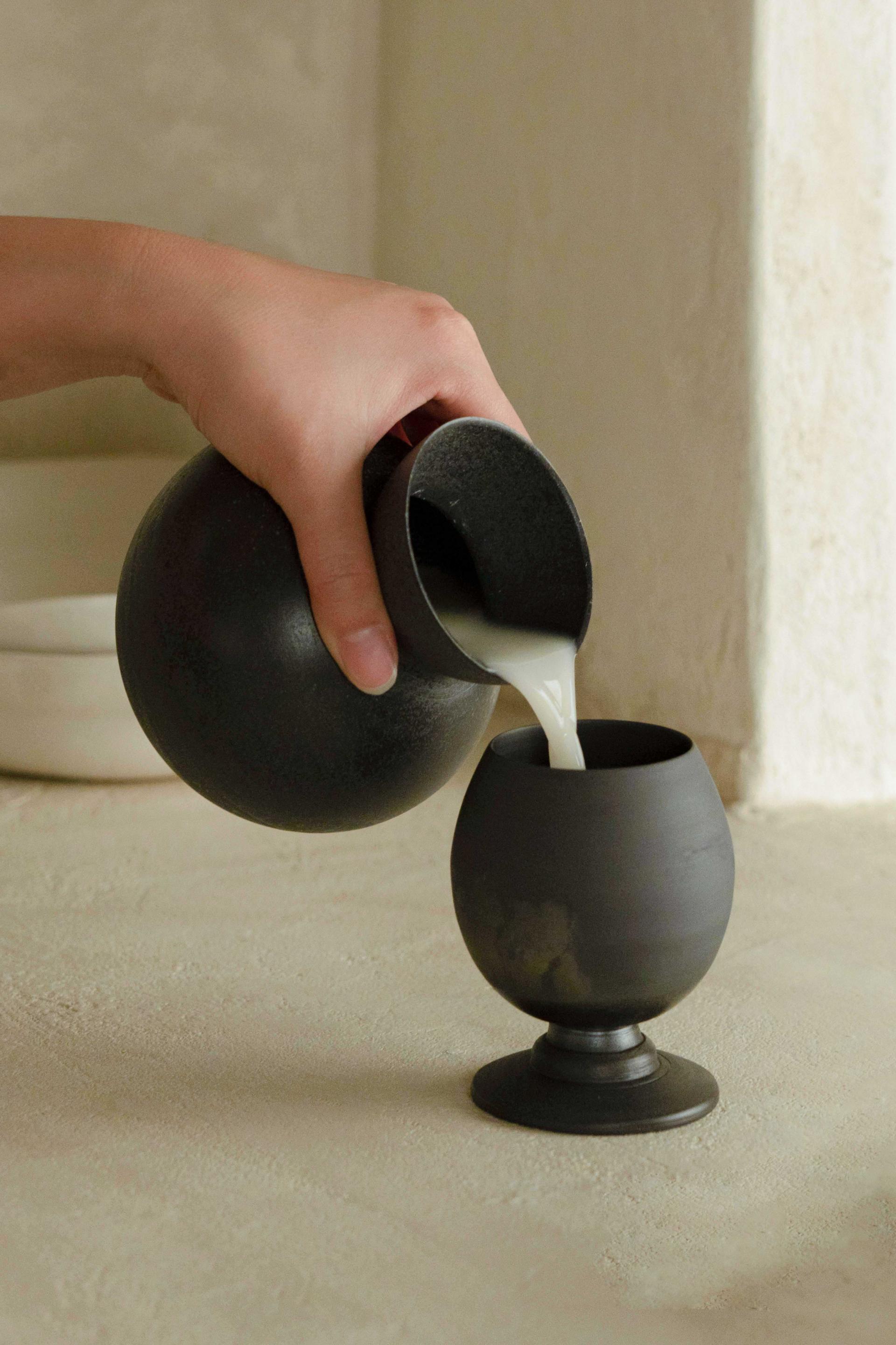 검은 허벅은 제주의 ‘검은굴’이라 불리는 돌가마에서 구워낸 지새 허벅을 모티브로 제작한 잔입니다. 화산회토로 빚어진 허벅이 가마에서 구워지는 동안의 시간이 이 작은 잔에 고스란히 담겨 있습니다. 검은 허벅의 푸른 빛은 화산회토가 뜨거운 불에 반응해 만들어낸 불의 흐름입니다. 두 가지 패턴은 켜켜이 쌓은 채로 구워내는 가마의 형태에서 비롯됩니다.