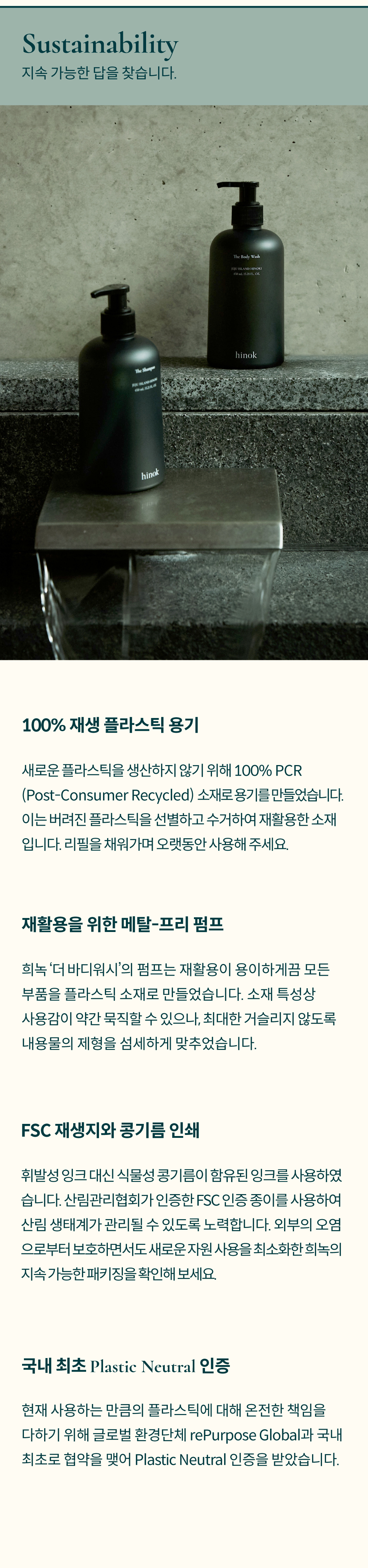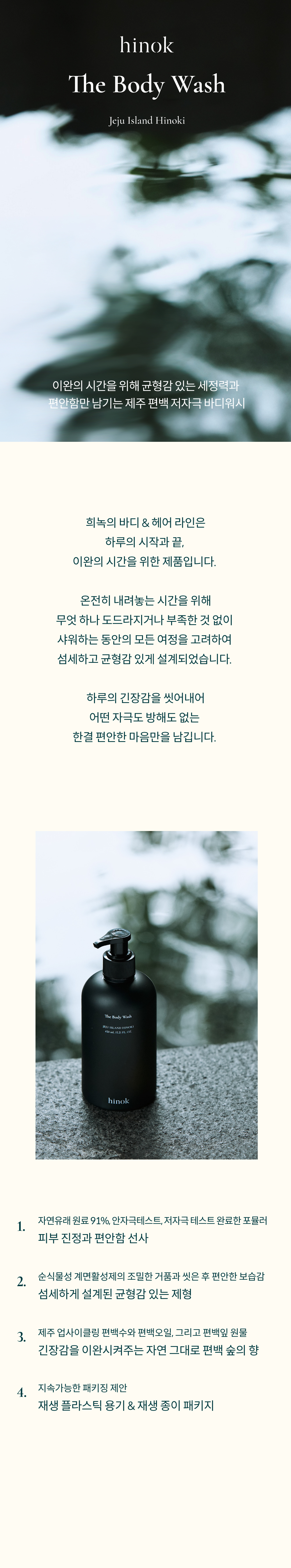 이완의 시간을 위해 균형감 있는 세정력과 편안함만 남기는 제주 편백 저자극 바디워시입니다.