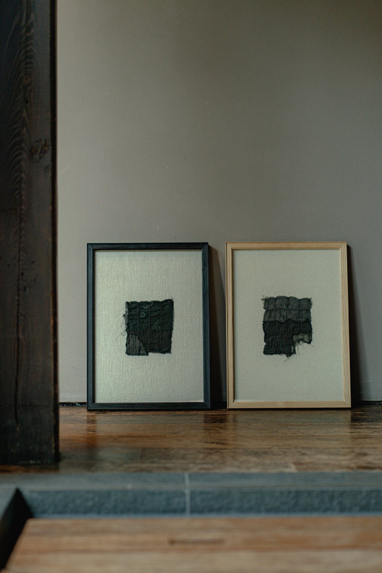 손바느질로 이어 붙인 먹염 조각보를 혼 퍼니쳐의 나무 액자에 담았으며, 성글고 가벼운 직물이 단단한 목재 프레임 안에서 완성됩니다. 직물의 묵색과 철매염한 나무의 짙음이 함축적이며 고요한 분위기를 가집니다.