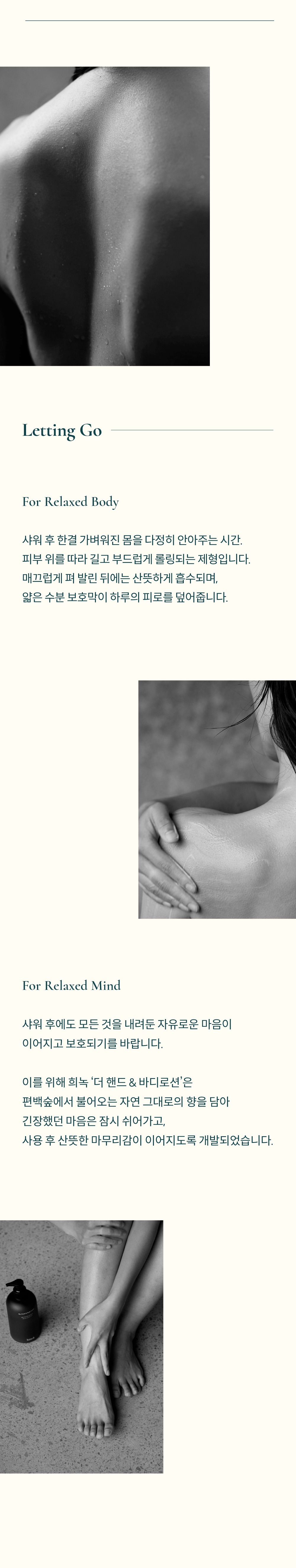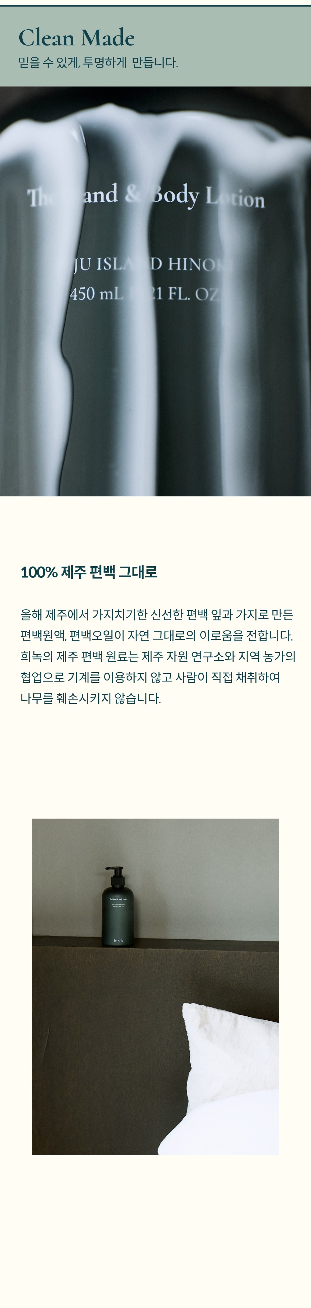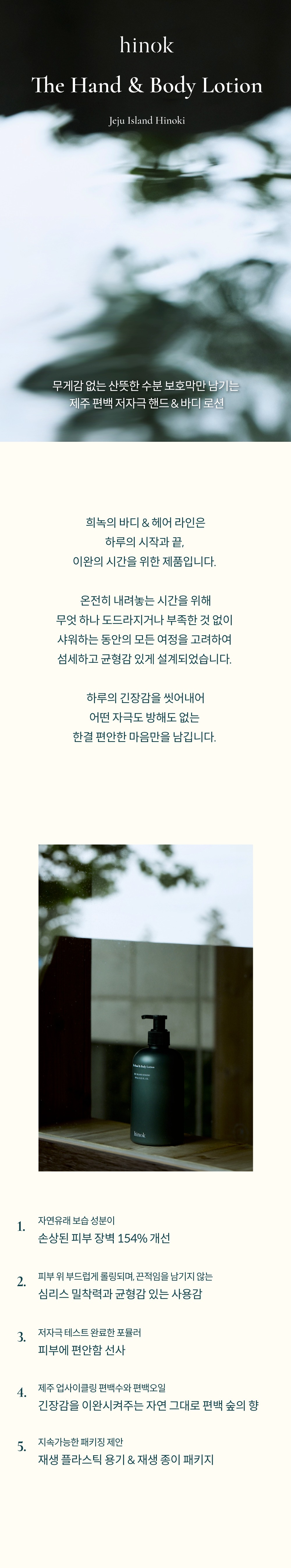 이완의 시간을 위한 무게감 없는 산뜻한 수분 보호막남 남기는 제주 편백 저자극 핸드&바디 로션입니다.