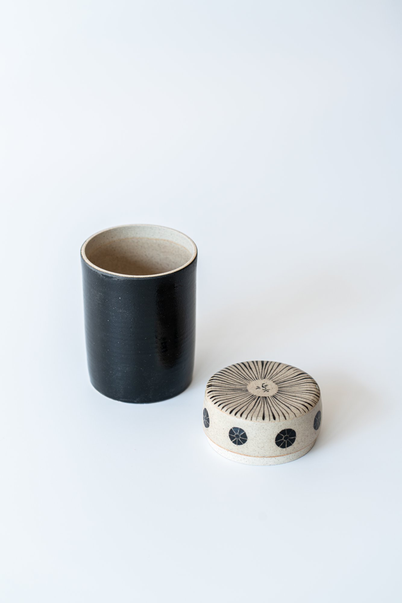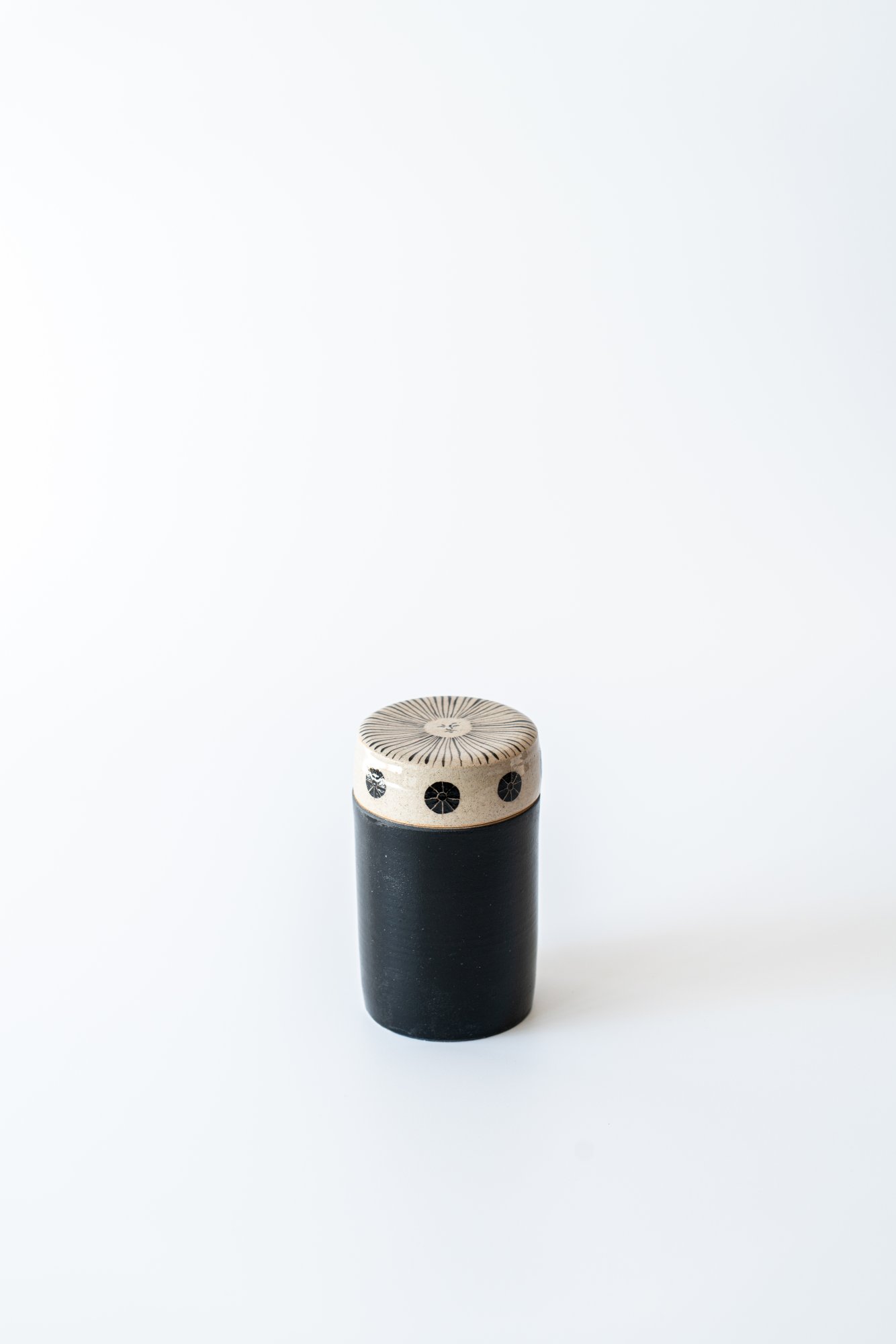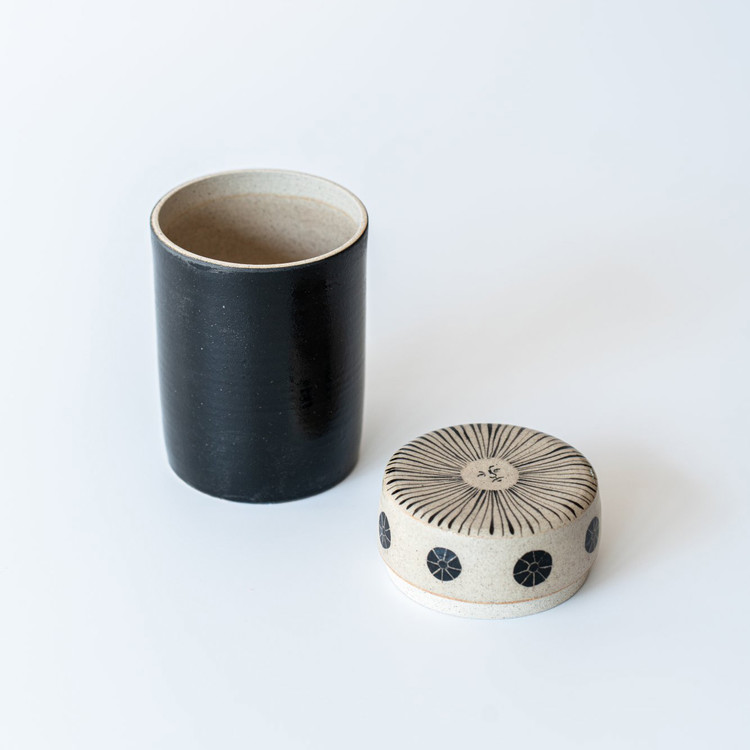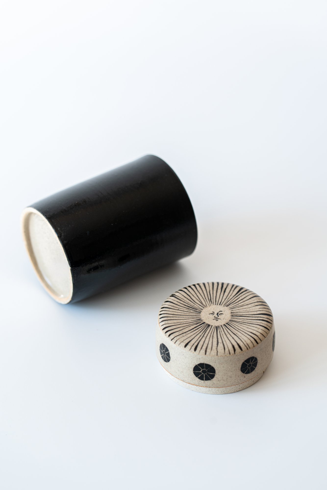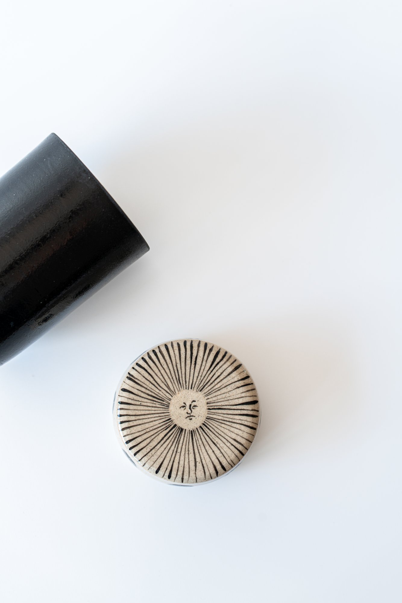 검은 몸체 위로 베이지빛 해가 고요히 번지고, ㅁ그 주위를 감싸는 선들은 햇살의 결을 닮았습니다.