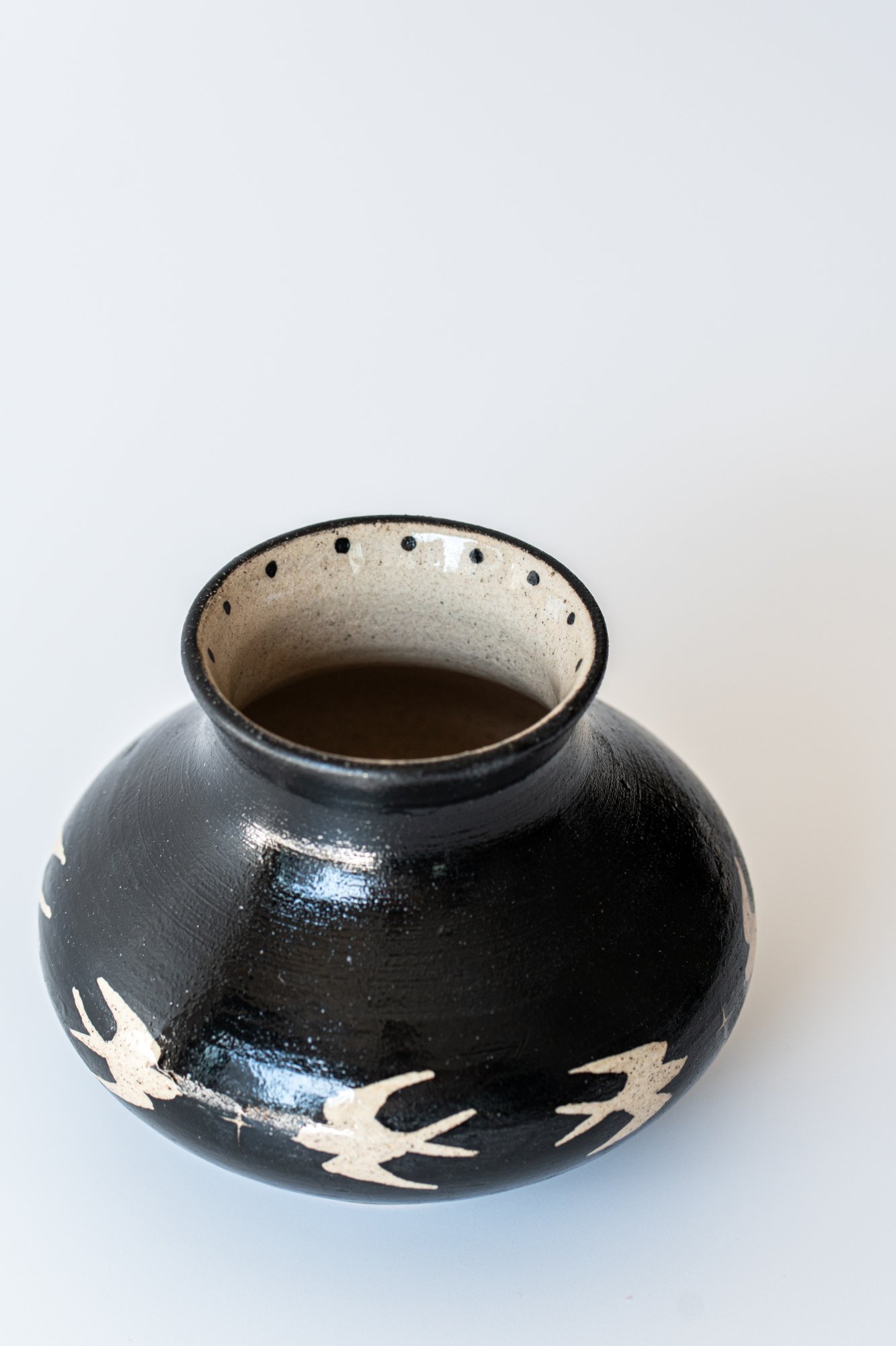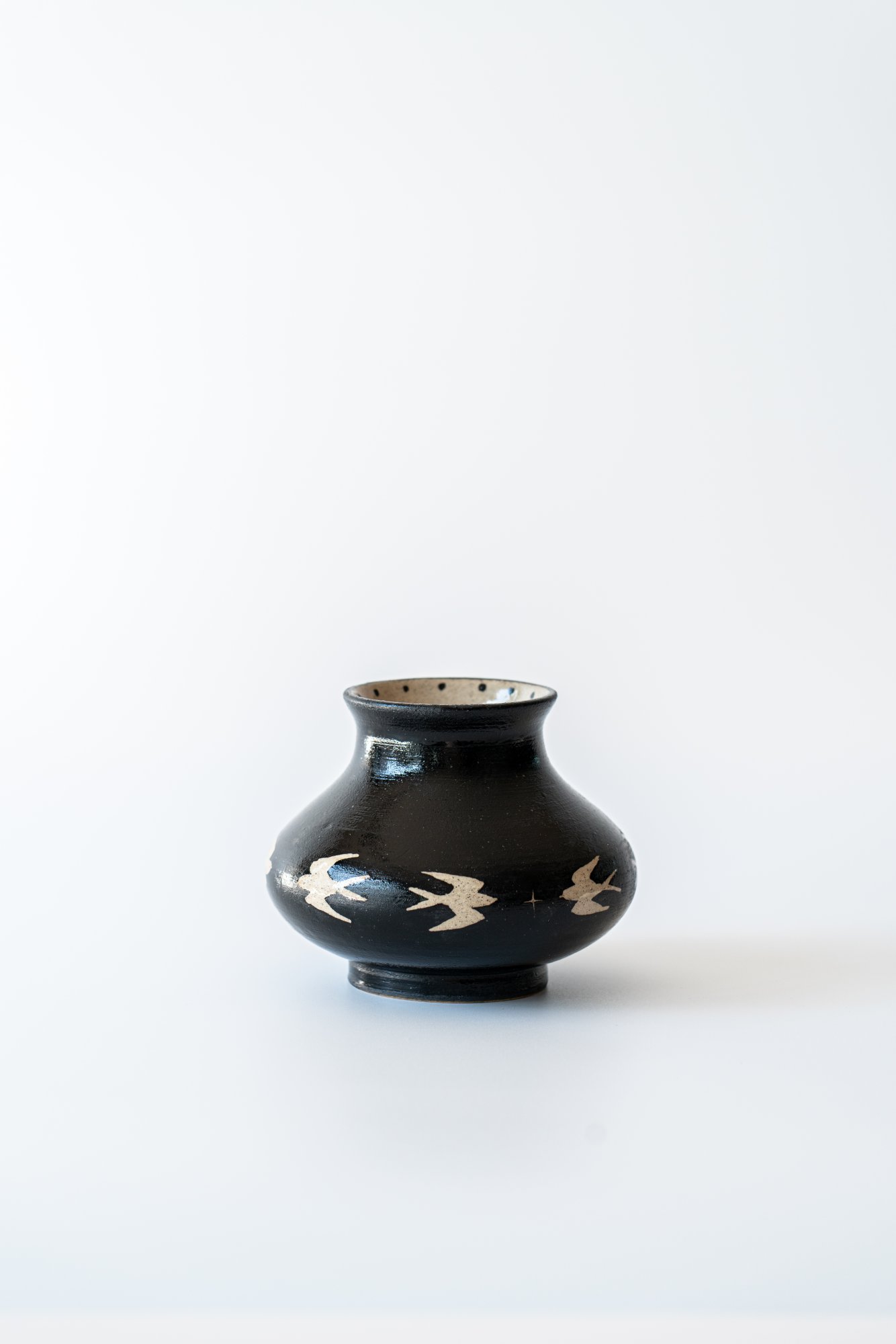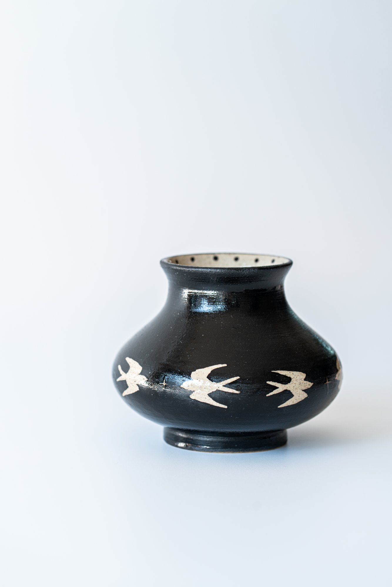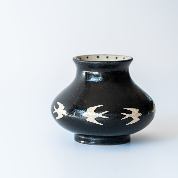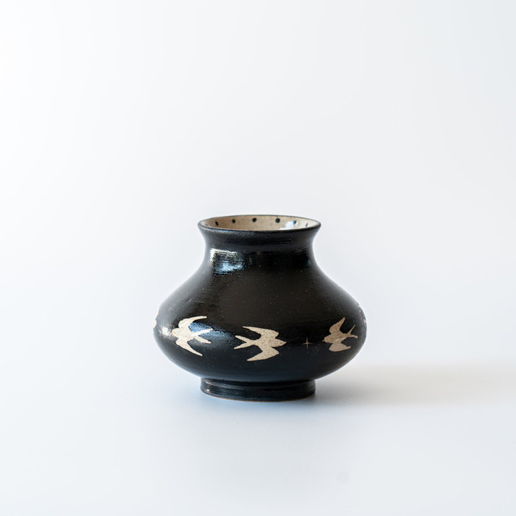넓게 펼쳐진 몸통과 낮은 목이 안정감 있는 실루엣을 만들어 주며, 제비들이 마치 지평선 위를 유영하듯 이어져 있어 한층 더 평온하고 넓은 풍경을 담은 듯합니다. 검은 밤, 그 위를 비행하는 생명들, 바람과 시간의 흐름까지 상상하게 하는 제비 화병입니다.