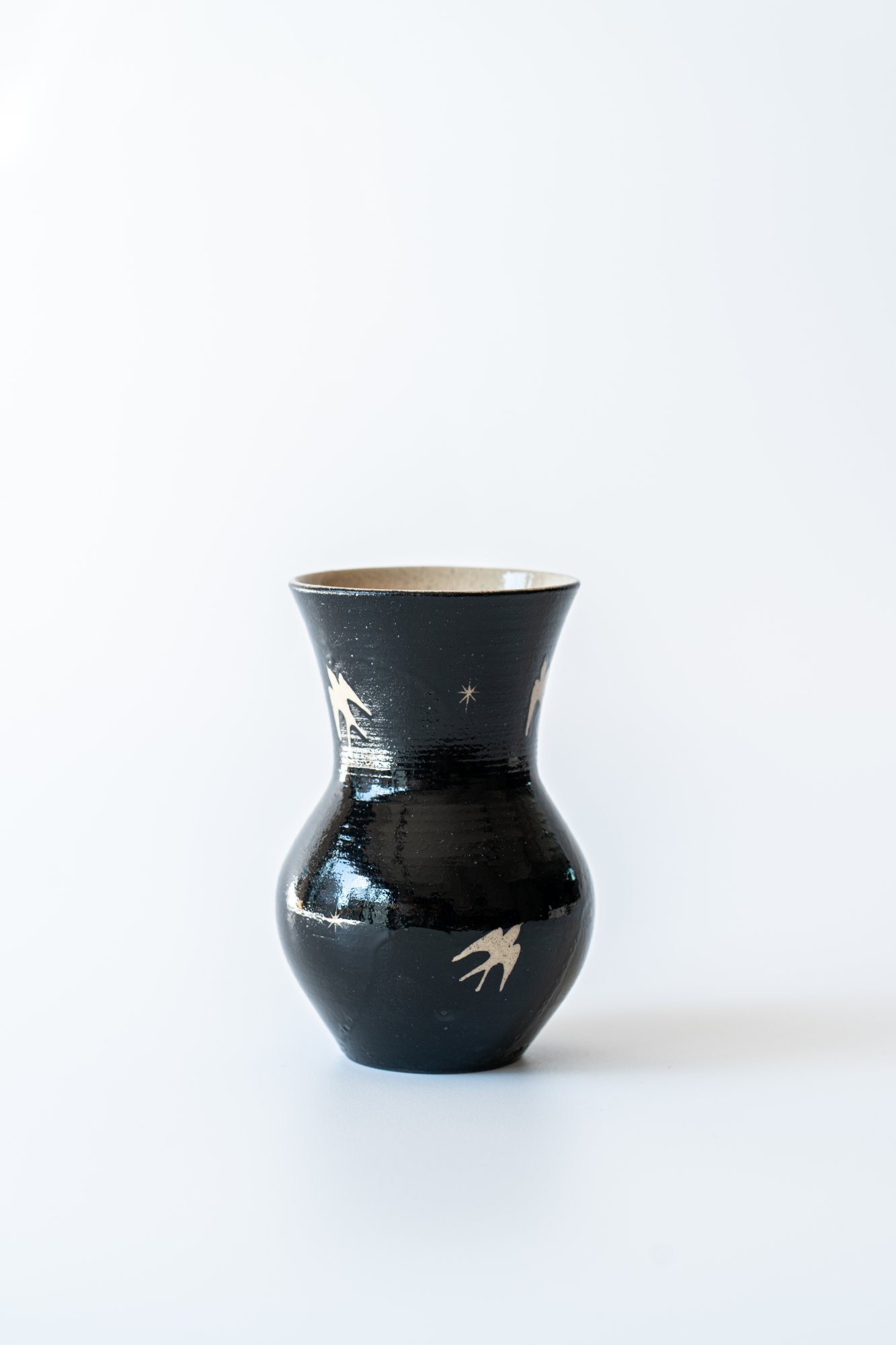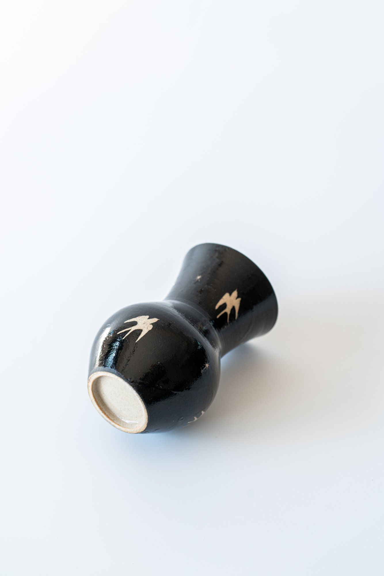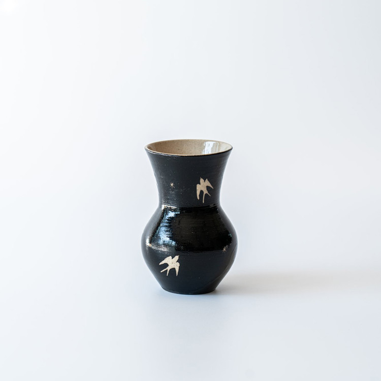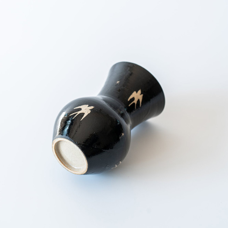 검은 바탕 위를 날아가는 제비들은 마치 해질녘 어스름한 하늘을 가로지르는 듯한 느낌을 주는 화병입니다. 굴곡진 형태는 제주 자연의 유려함과 닮아 있습니다.