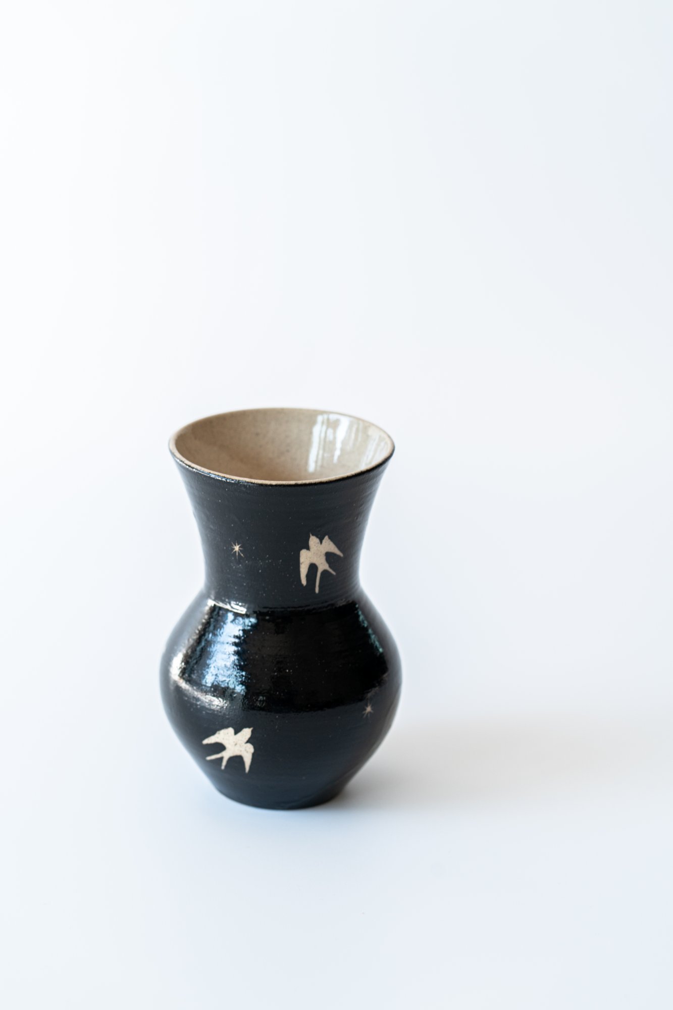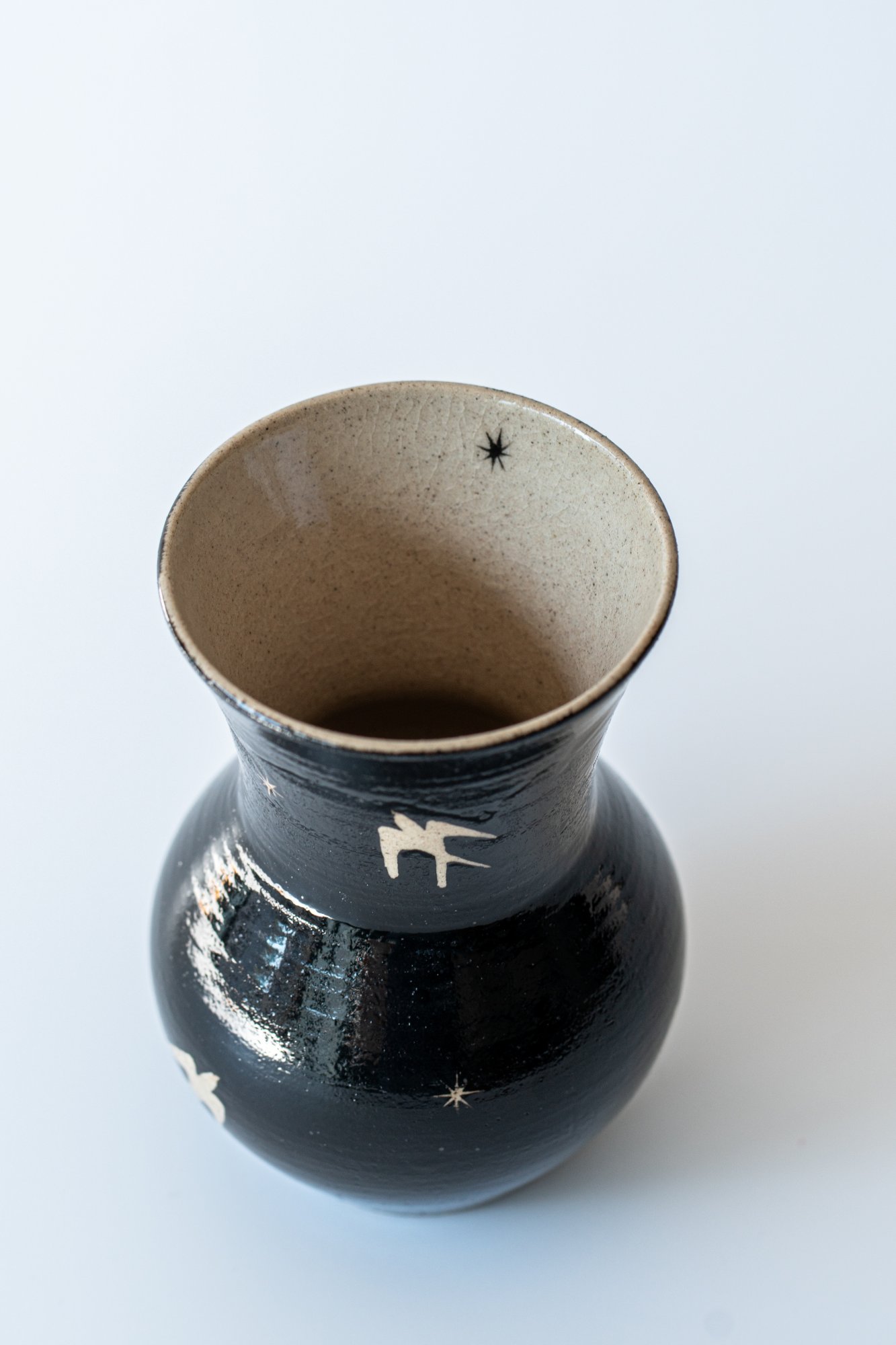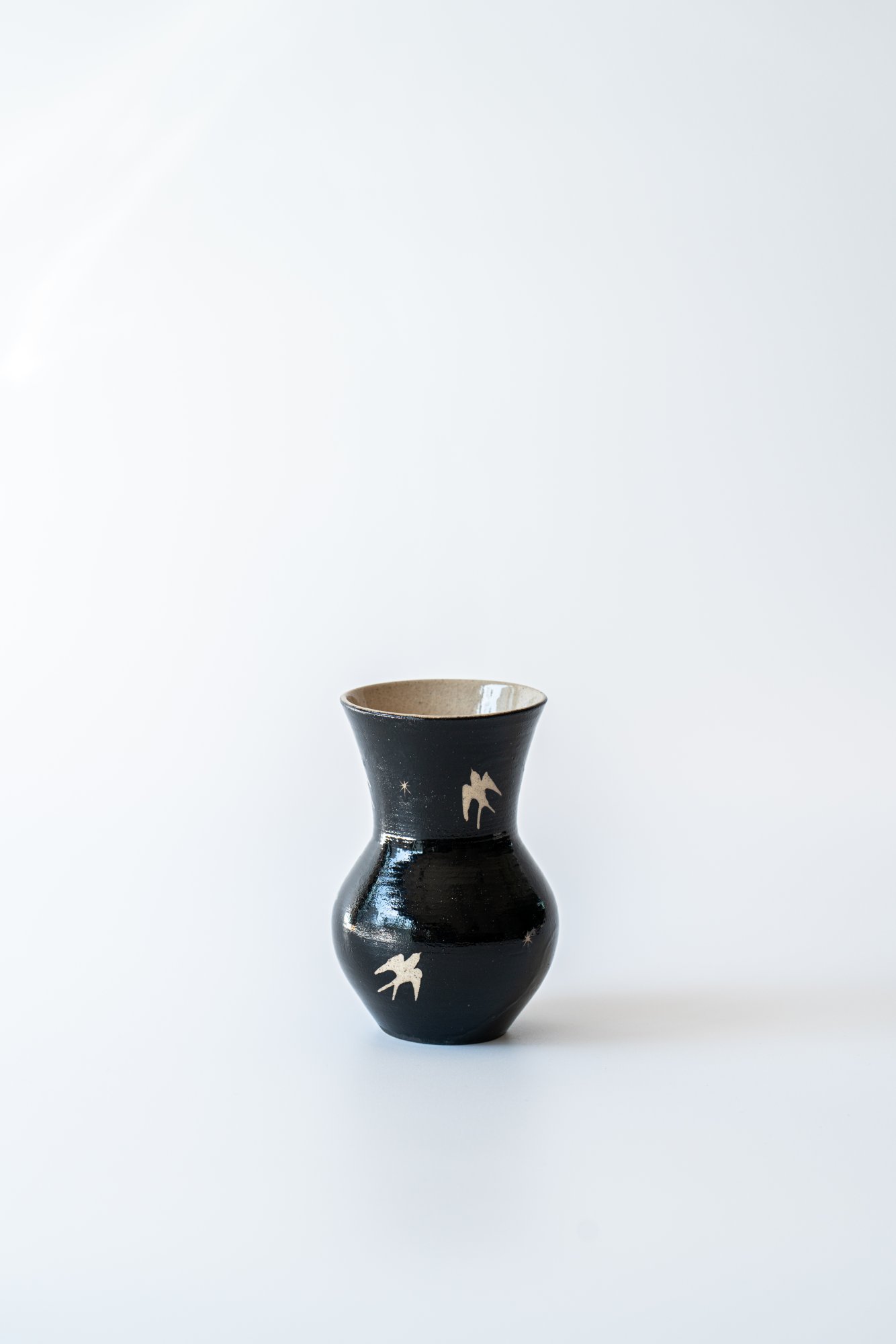 검은 바탕 위를 날아가는 제비들은 마치 해질녘 어스름한 하늘을 가로지르는 듯한 느낌을 주는 화병입니다. 굴곡진 형태는 제주 자연의 유려함과 닮아 있습니다.