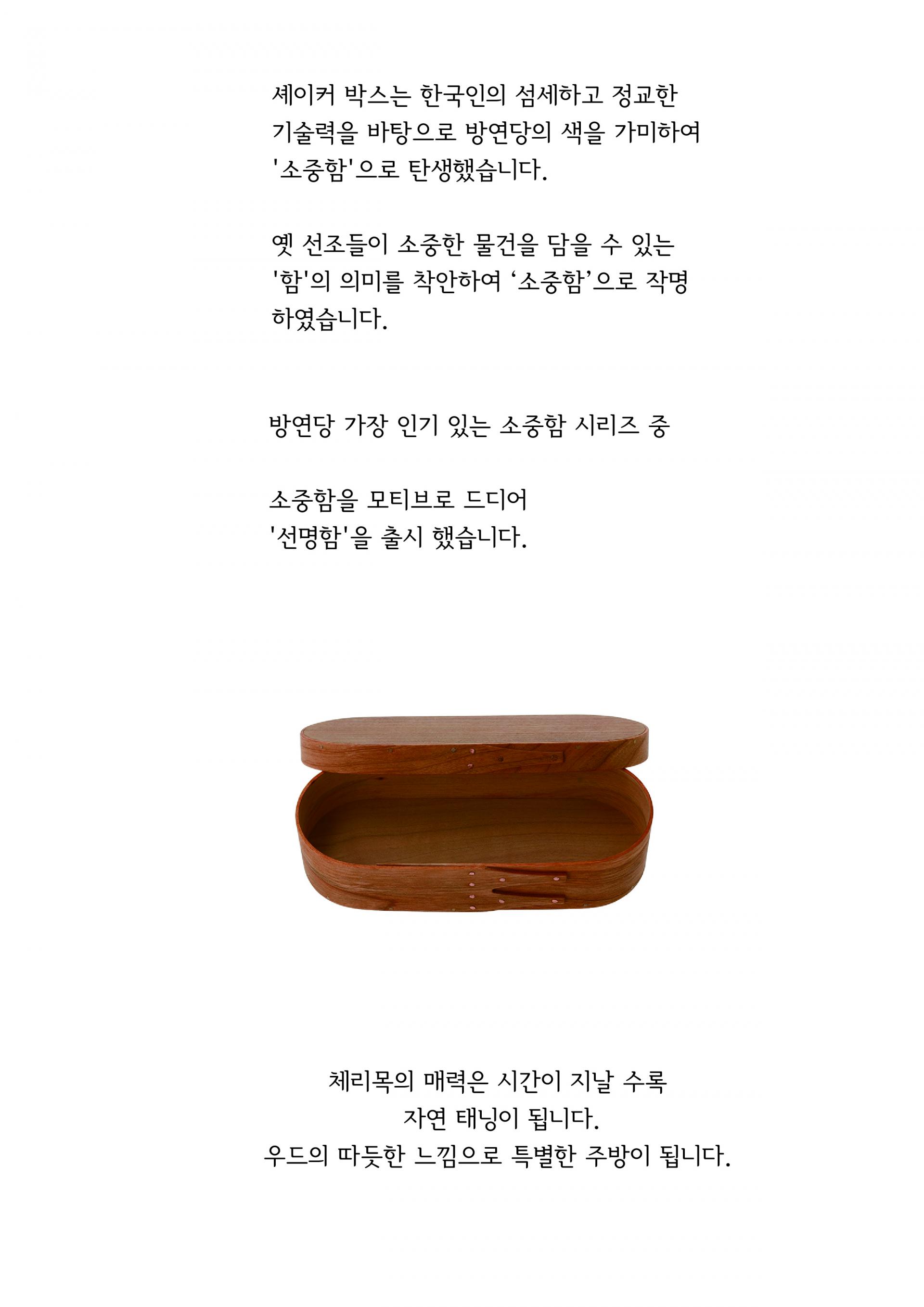 셰이커 박스는 한국인의 섬세하고 정교한 기술력을 바탕으로, 방연당의 색을 가미하여 '소중함'으로 탄생했습니다. 옛 선조들이 소중한 물건을 담을 수 있는 '함'의 의미를 착안하여 '소중함'으로 작명하였습니다.