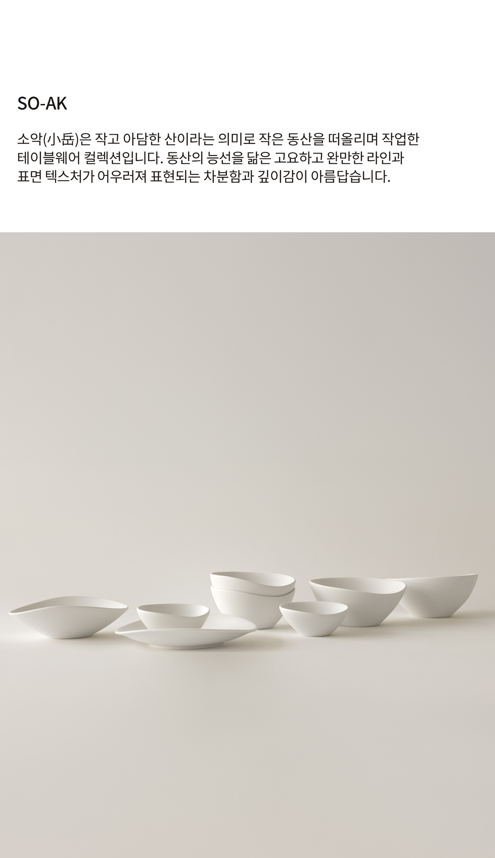 ‘소악(小岳)’은 작고 아담한 산을 뜻하며, 작은 동산의 완만한 능선에서 영감을 받아 탄생한 테이블웨어 컬렉션입니다. 완만한 라인과 고요한 있는 색감, 그리고 독특한 표면 텍스처가 어우러져 차분하면서도 깊이 있는 아름다움을 전합니다.