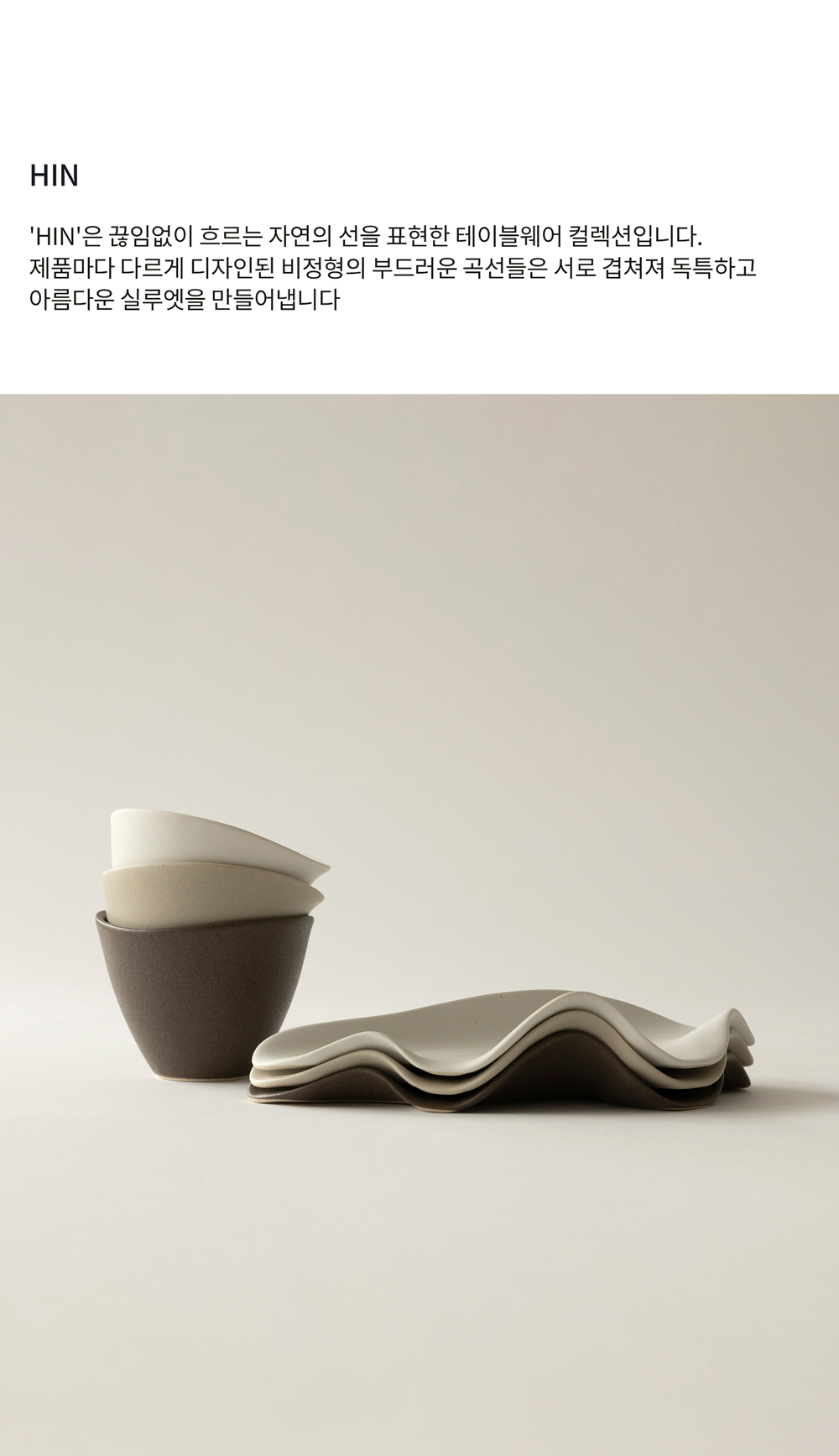 HIN'은 끊임없이 흐르는 자연의 선을 표현한 테이블웨어 컬렉션입니다. 제품마다 다르게 디자인된 비정형의 부드러운 곡선이 겹쳐져 아름다운 실루엣을 만들어 냅니다.
