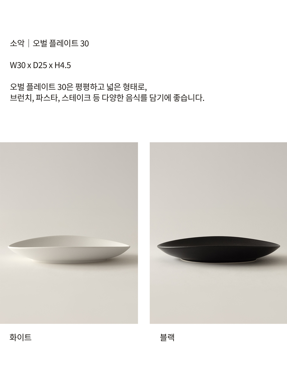 오벌 플레이트 30은 평평하고 넓은 형태로, 브런치, 파스타, 스테이크 등 다양한 음식를 담기에 좋습니다.