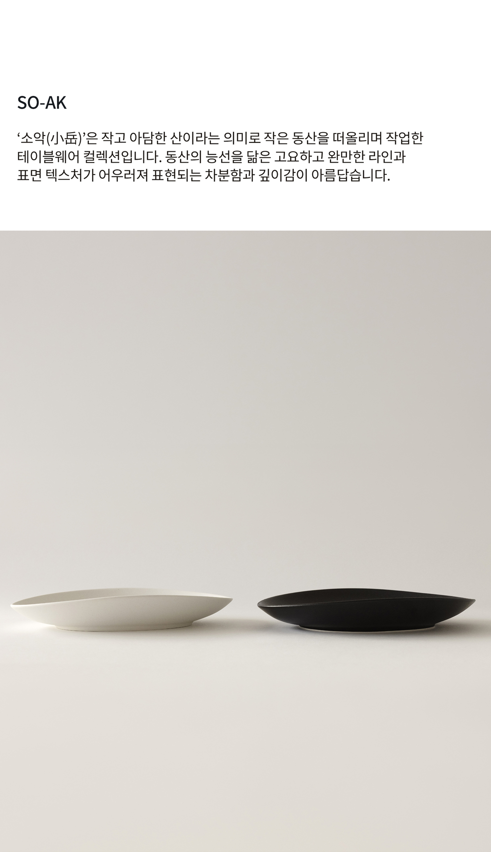 ‘소악(小岳)’은 작고 아담한 산을 뜻하며, 작은 동산의 완만한 능선에서 영감을 받아 탄생한 테이블웨어 컬렉션입니다. 완만한 라인과 고요한 있는 색감, 그리고 독특한 표면 텍스처가 어우러져 차분하면서도 깊이 있는 아름다움을 전합니다.