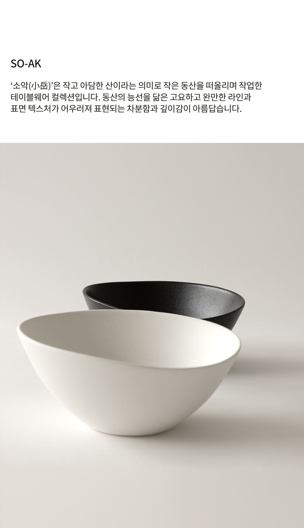 ‘소악(小岳)’은 작고 아담한 산을 뜻하며, 작은 동산의 완만한 능선에서 영감을 받아 탄생한 테이블웨어 컬렉션입니다. 완만한 라인과 고요한 있는 색감, 그리고 독특한 표면 텍스처가 어우러져 차분하면서도 깊이 있는 아름다움을 전합니다.