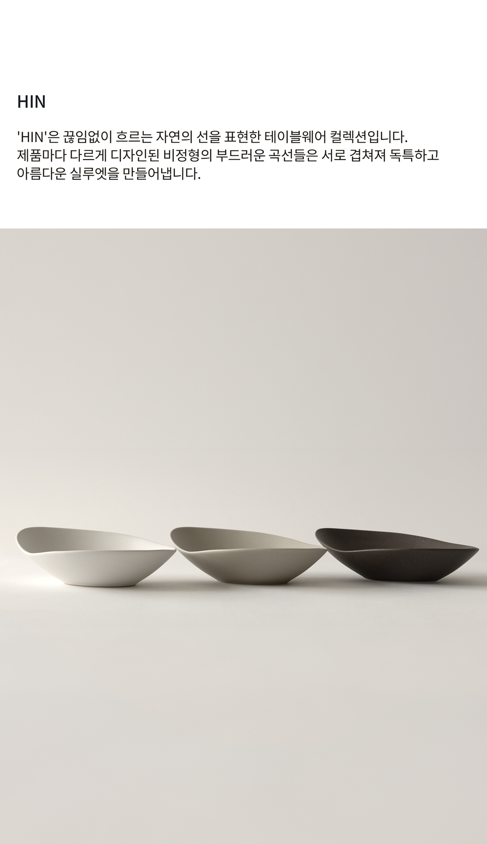 HIN'은 끊임없이 흐르는 자연의 선을 표현한 테이블웨어 컬렉션입니다. 제품마다 다르게 디자인된 비정형의 부드러운 곡선이 겹쳐져 아름다운 실루엣을 만들어 냅니다.