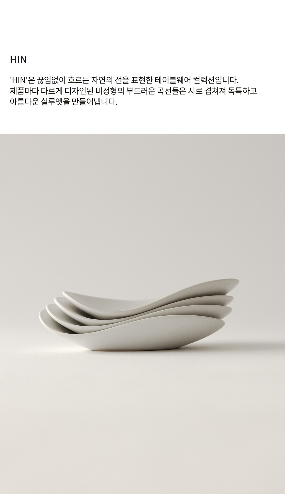 HIN'은 끊임없이 흐르는 자연의 선을 표현한 테이블웨어 컬렉션입니다. 제품마다 다르게 디자인된 비정형의 부드러운 곡선이 겹쳐져 아름다운 실루엣을 만들어 냅니다.
