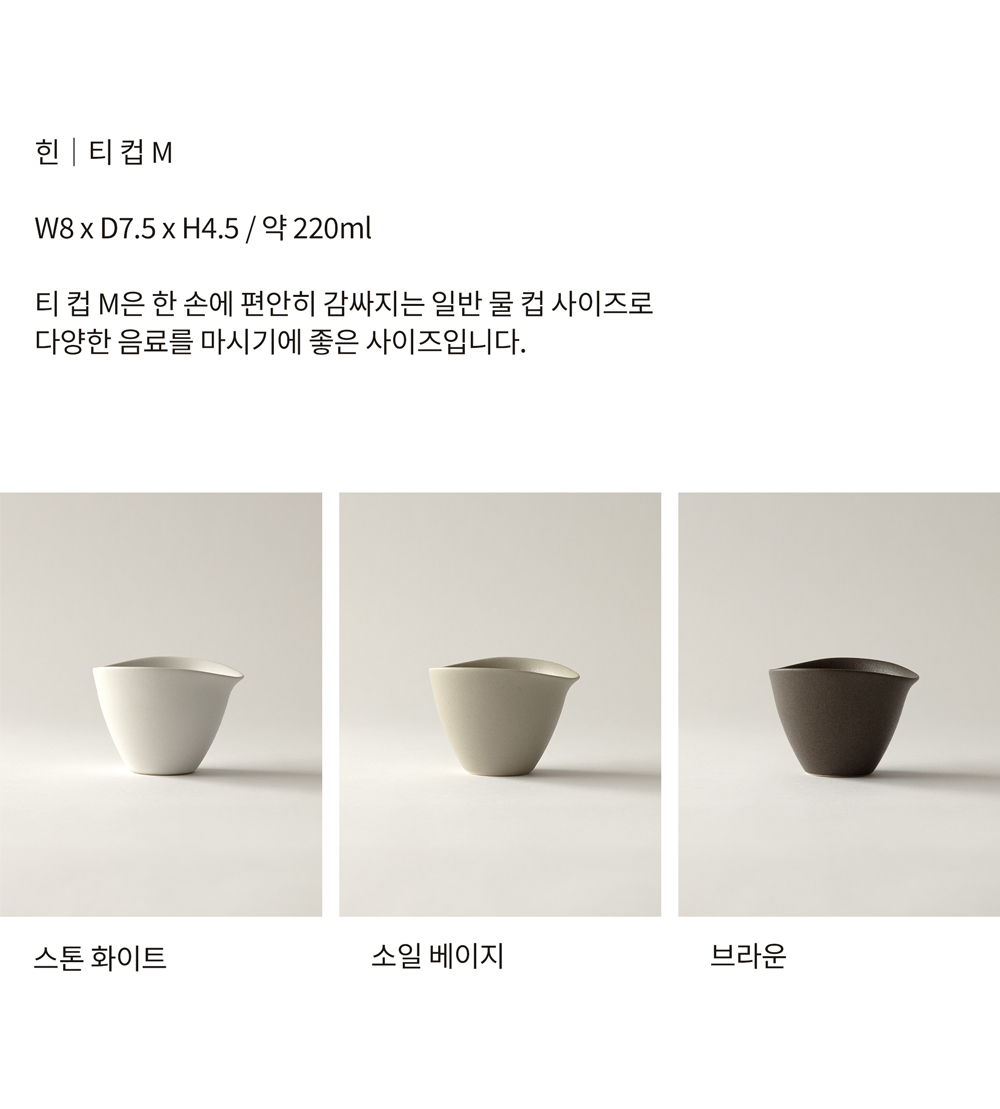 티 컵 M은 한 손에 편안히 감싸지는 일반 물 컵 사이즈로 다양한 음료를 마시기에 좋은 사이즈입니다.