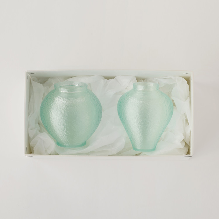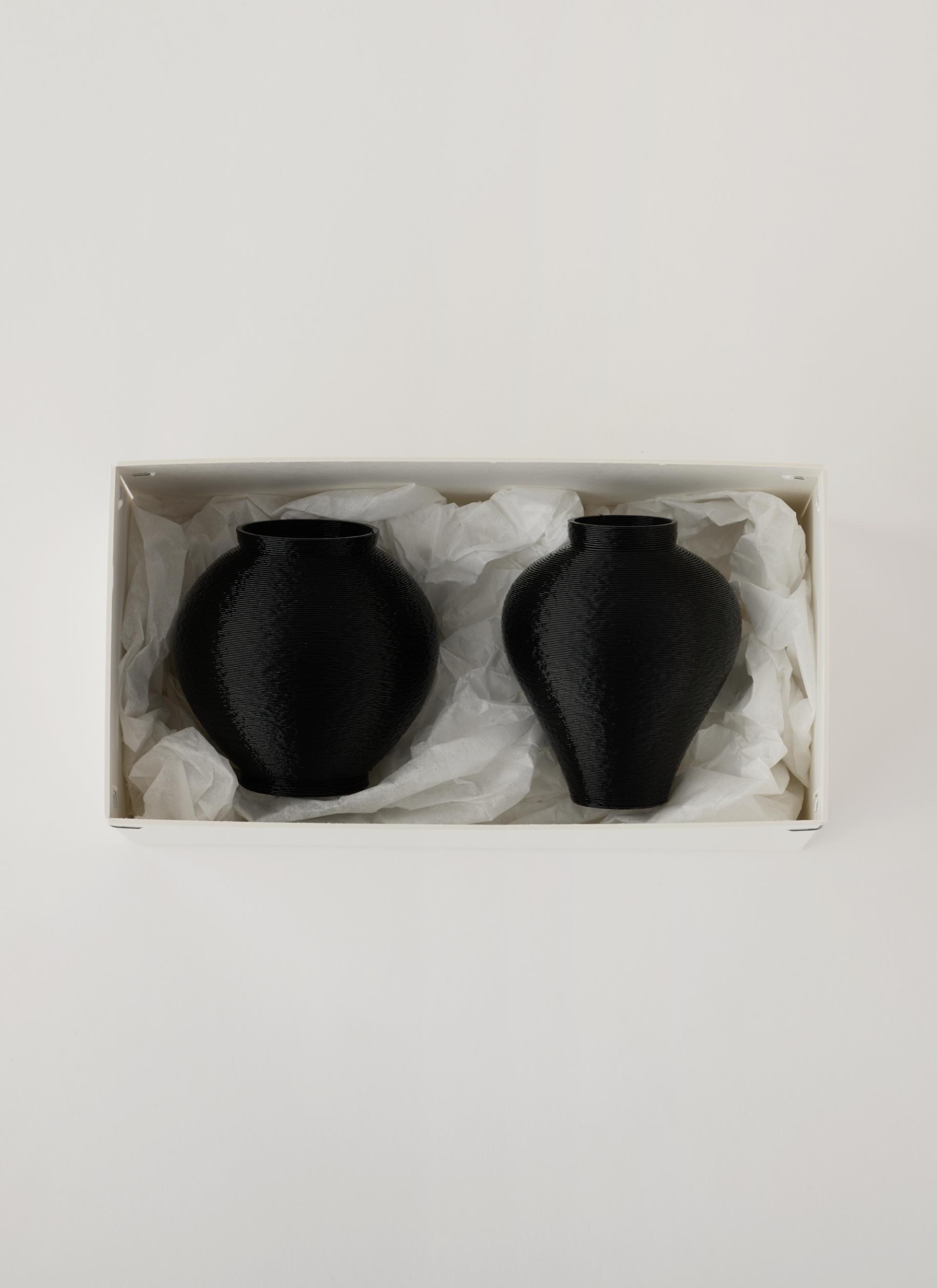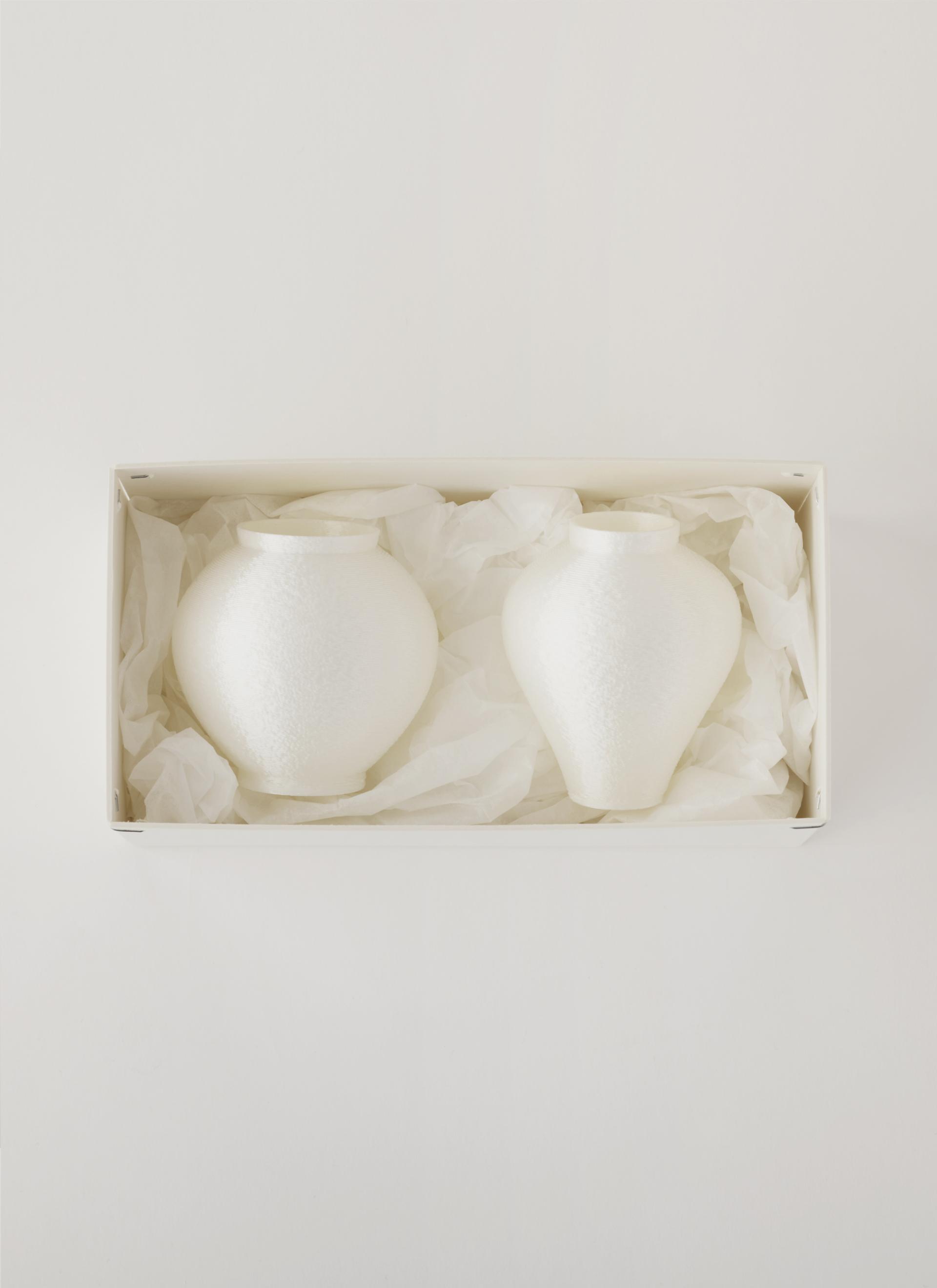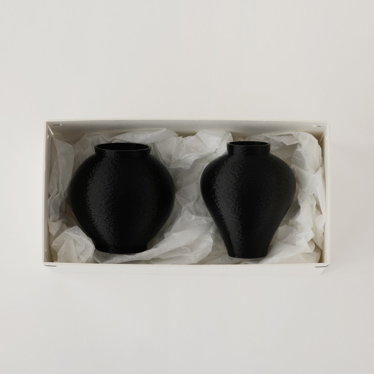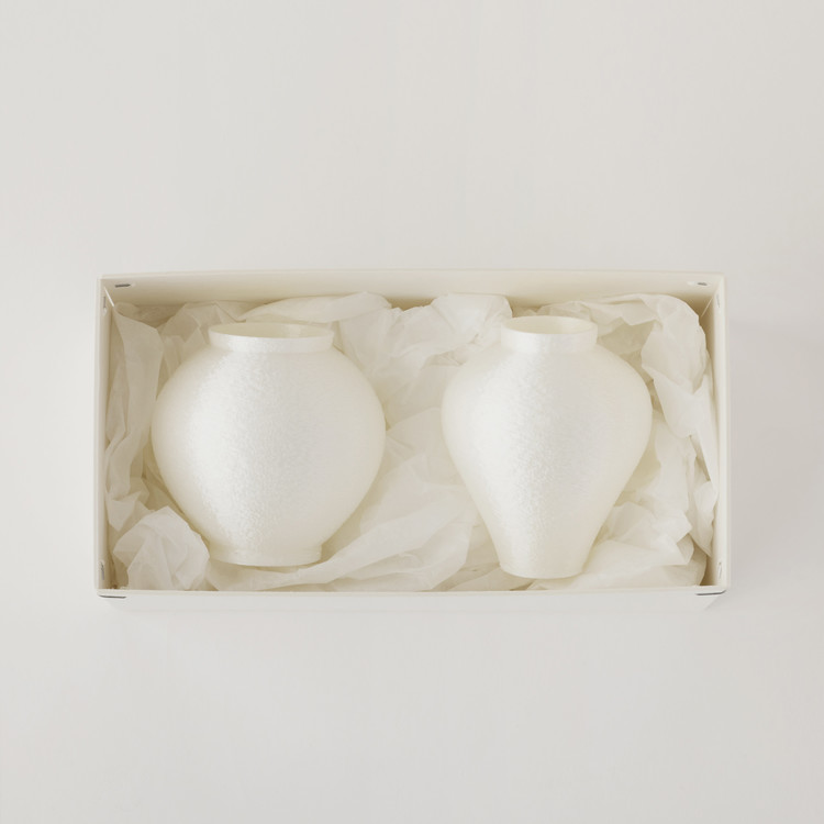 달항아리와 백자는 조선 시대 도자기 중에서도 가장 아름다운 형태로 손꼽힙니다. 보름달처럼 둥근 실루엣과 간결한 볼륨은 비움을 통해 여백을 채우는 한국 고유의 미감을 담고 있습니다. 고요하고 깊이 있는 아름다움을 전하며 오늘날까지도 많은 이들에게 사랑받고 있습니다. 이 작품은 현대적인 3D 프린팅 기술로 재해석했습니다. 한 층 한 층 정교하게 쌓아올리는 방식으로 완성되어, 표면에는 마치 반짝이는 윤슬을 닮은 결이 은은하게 살아 있습니다.