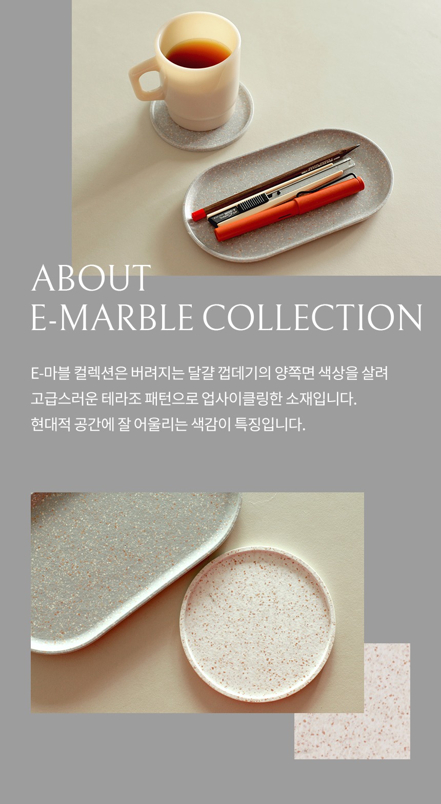 버려지는 달걀 껍데기의 양쪽면 색상을 살려 고급스러운 테라조 패턴으로 업사이클링한 소재입니다. 현대적 공간에 잘 어울리는 색감이 특징입니다.