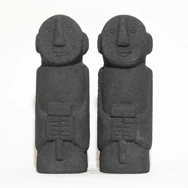 제주 동자석은 돌아가신 이의 곁을 지키는 한 쌍의 석상입니다. 손에 쥔 ‘지물’은 망자에게 전하는 상징적인 메시지로, 지금의 이모티콘처럼 감정이나 의미를 담고 있습니다.