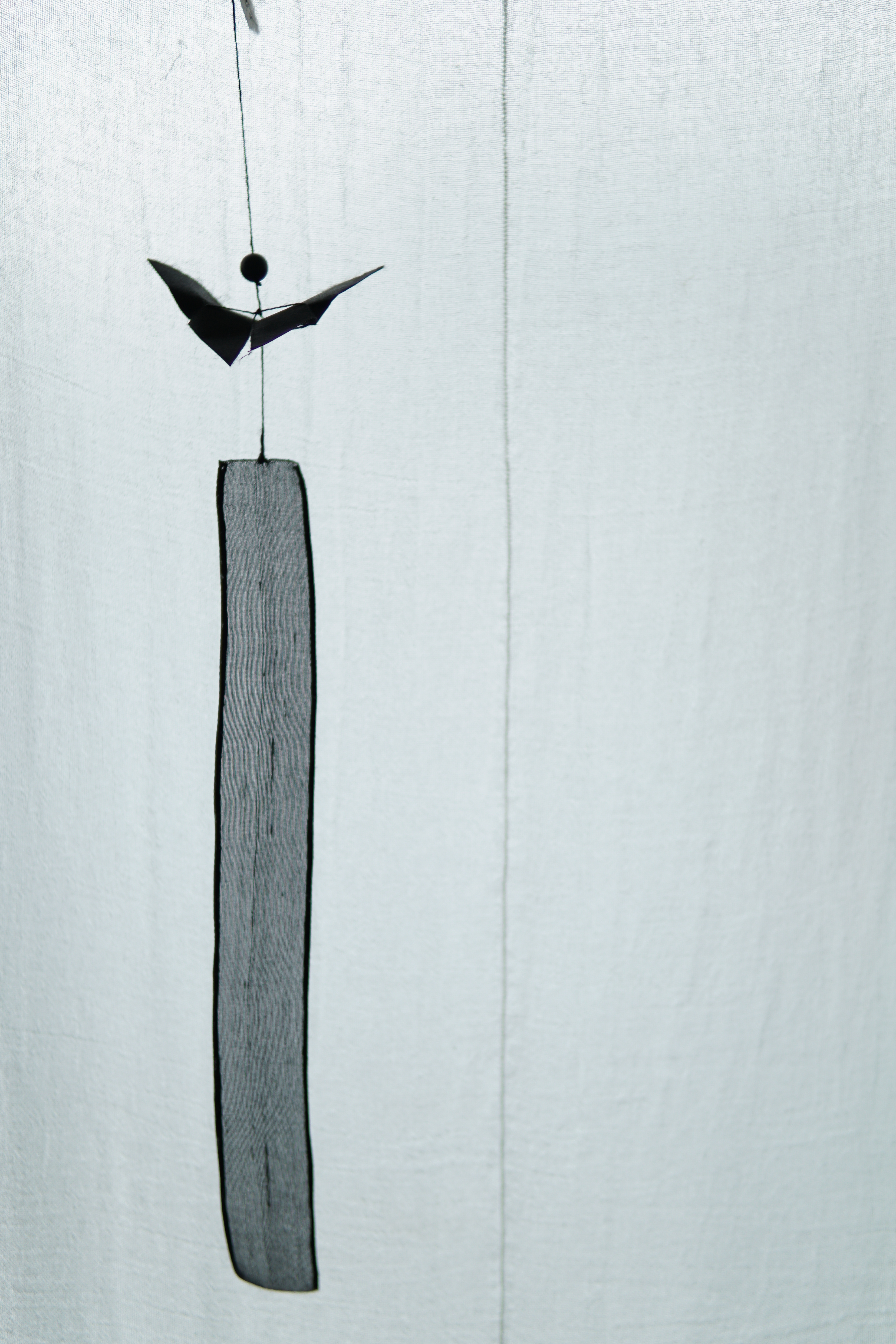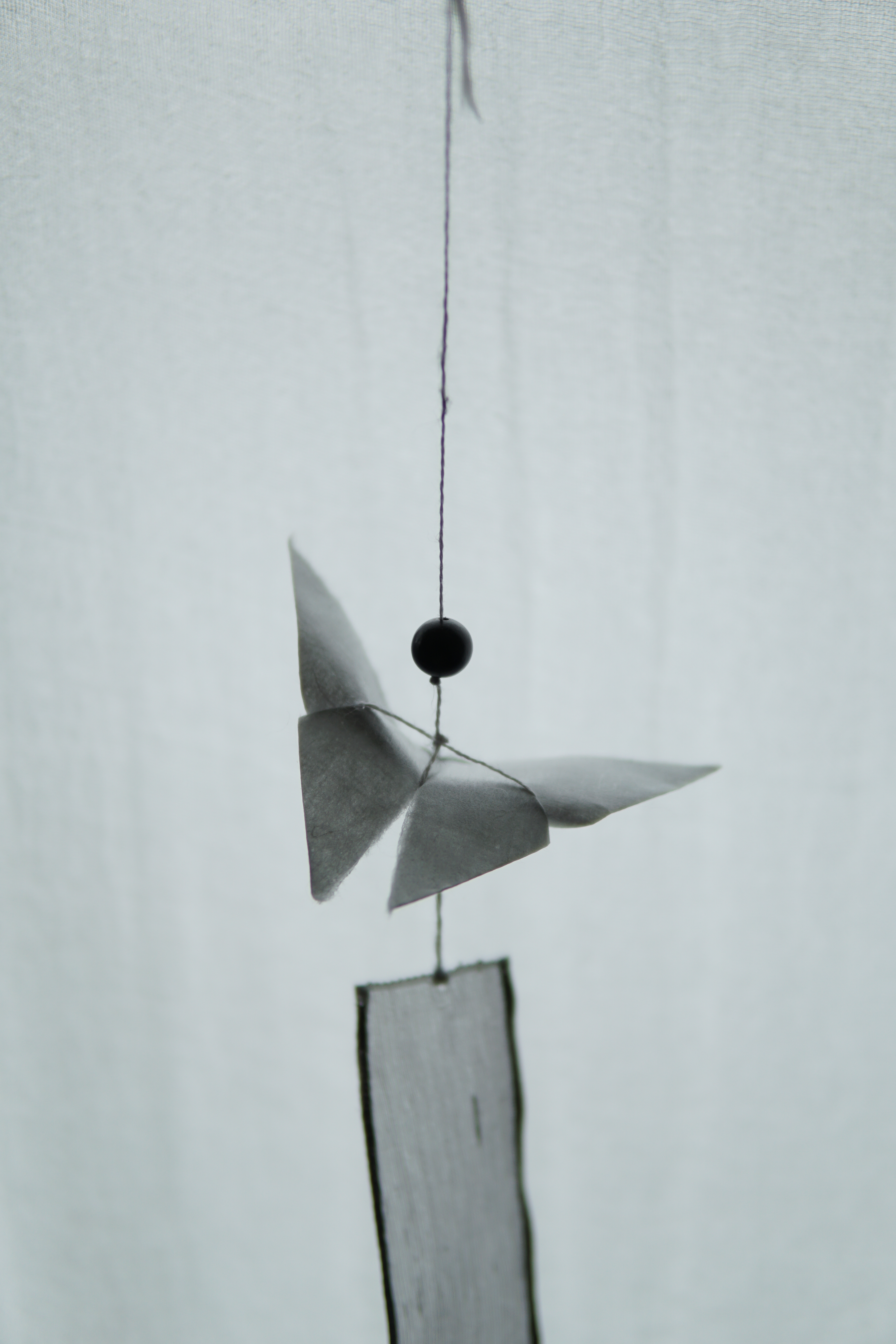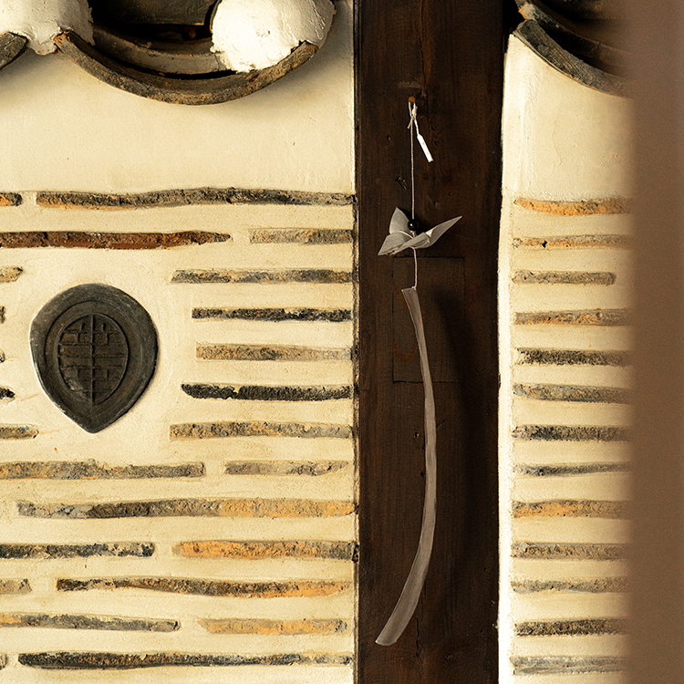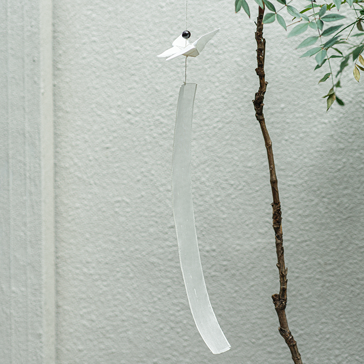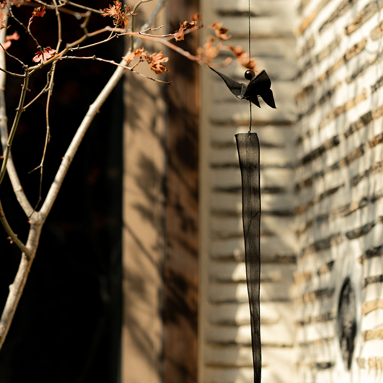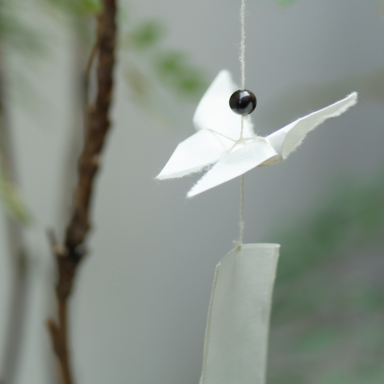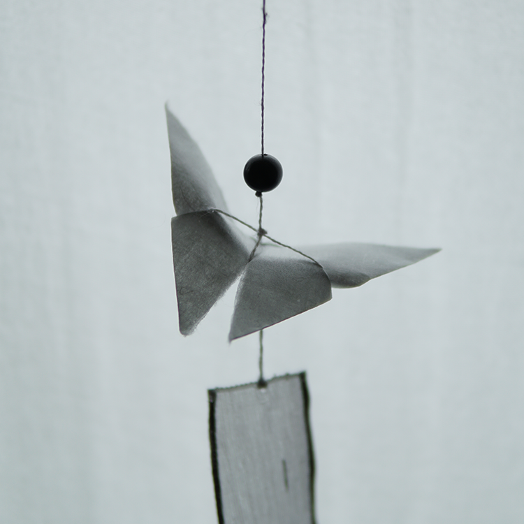 나비가 날아다니면 행운이 생길 것 같은 작은 기쁨이 주위에 일렁입니다. 그런 소망을 염원하며 한지로 나비를 접고, 반투명한 옥사를 늘어뜨려 긴 꼬리를 만들었습니다.