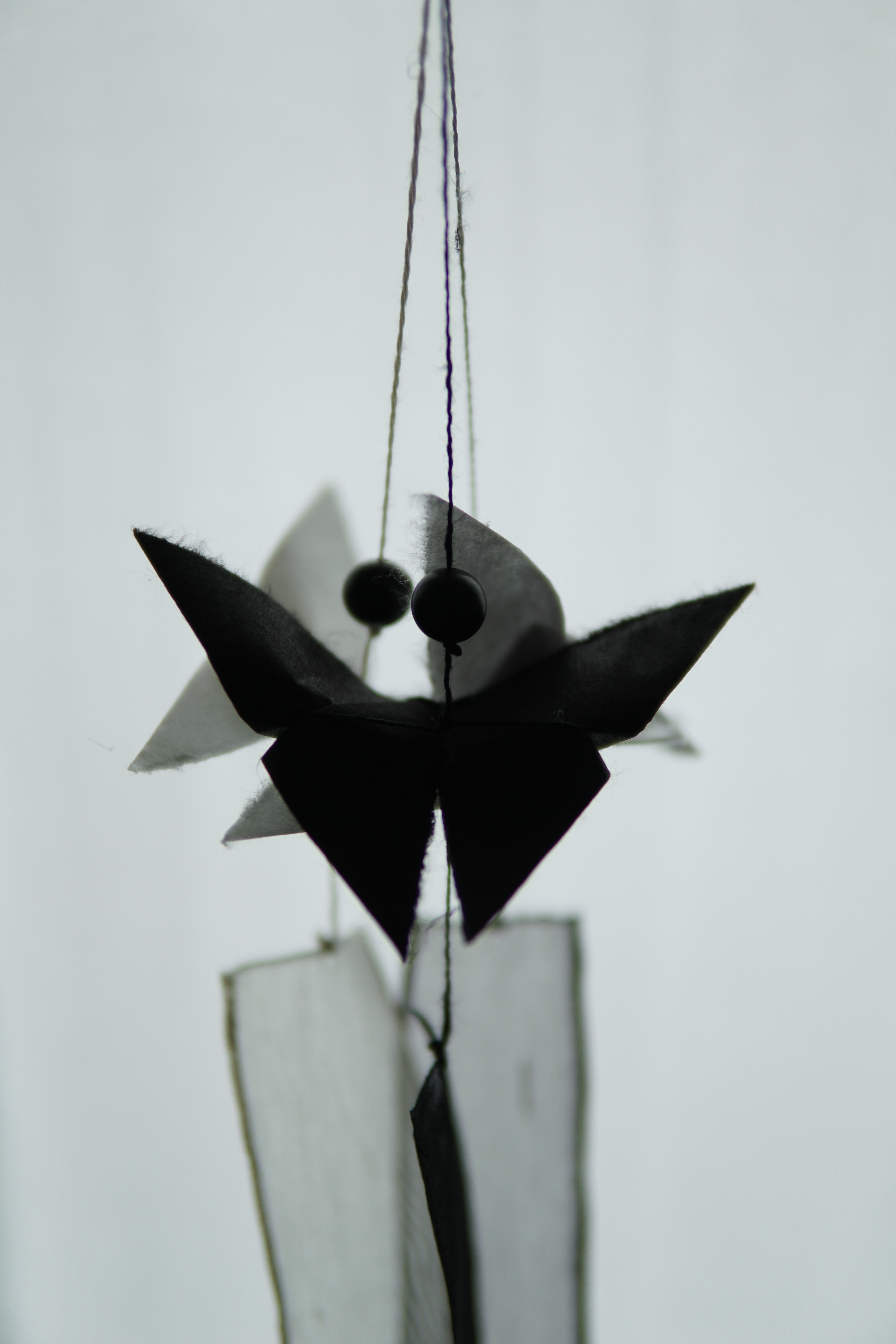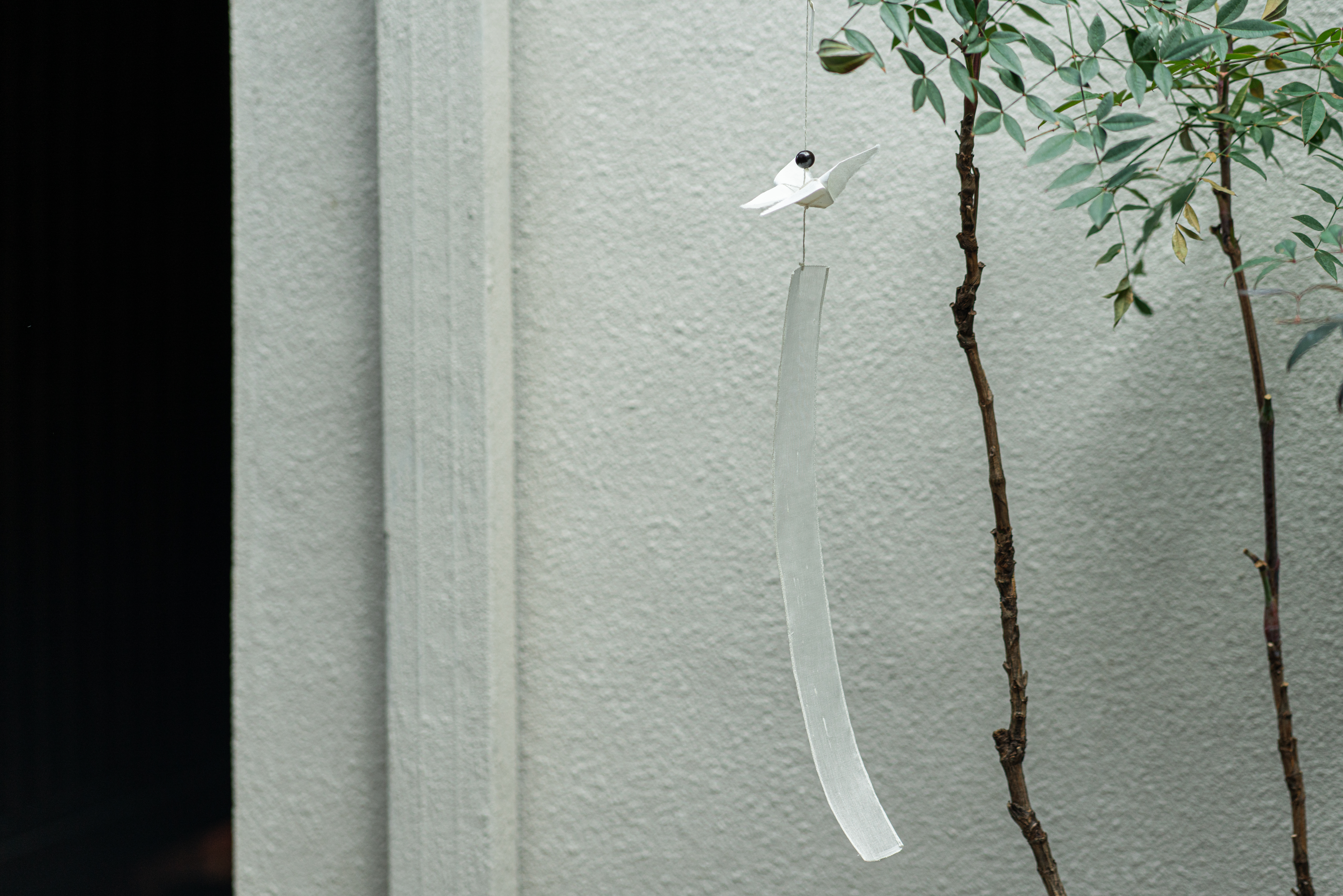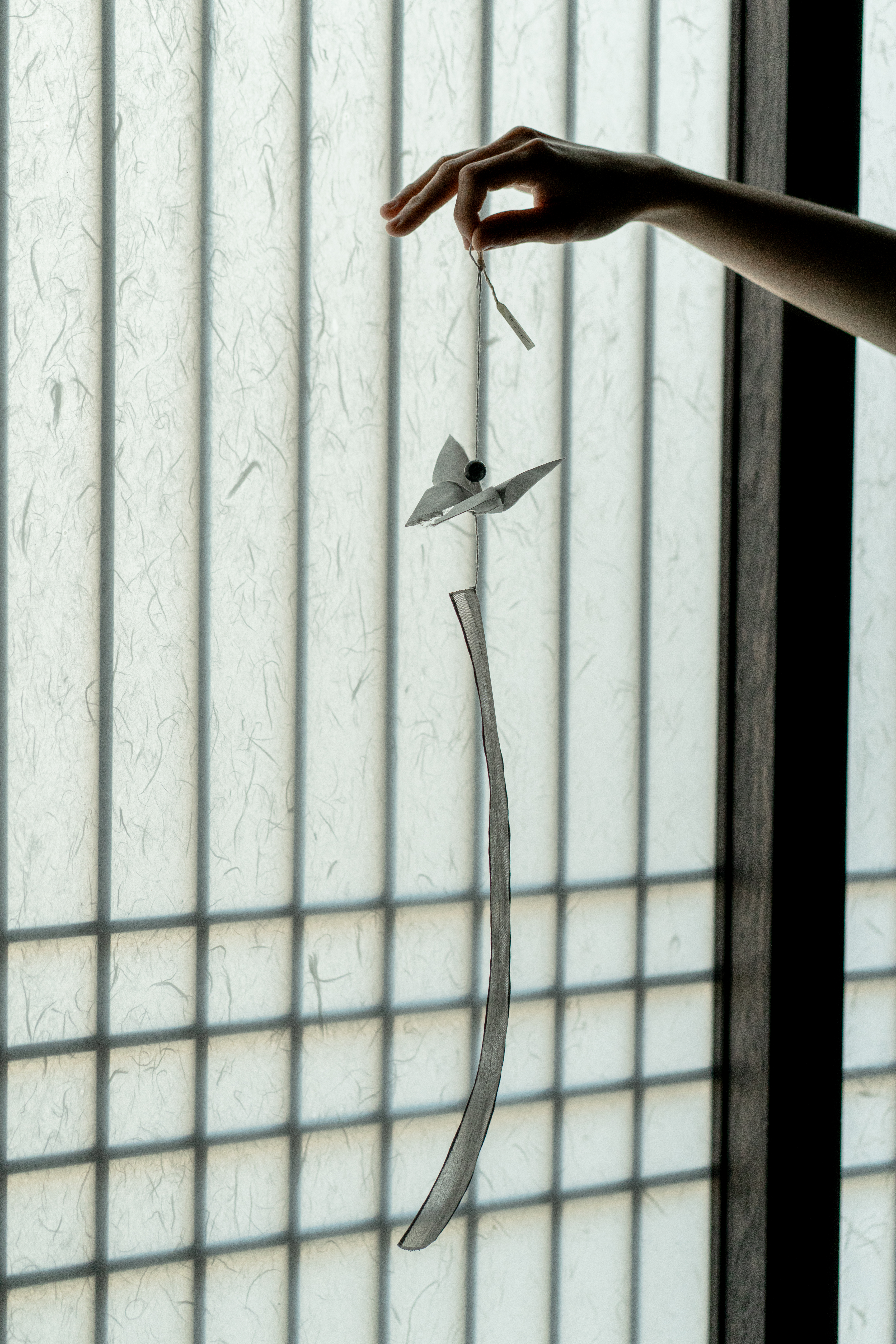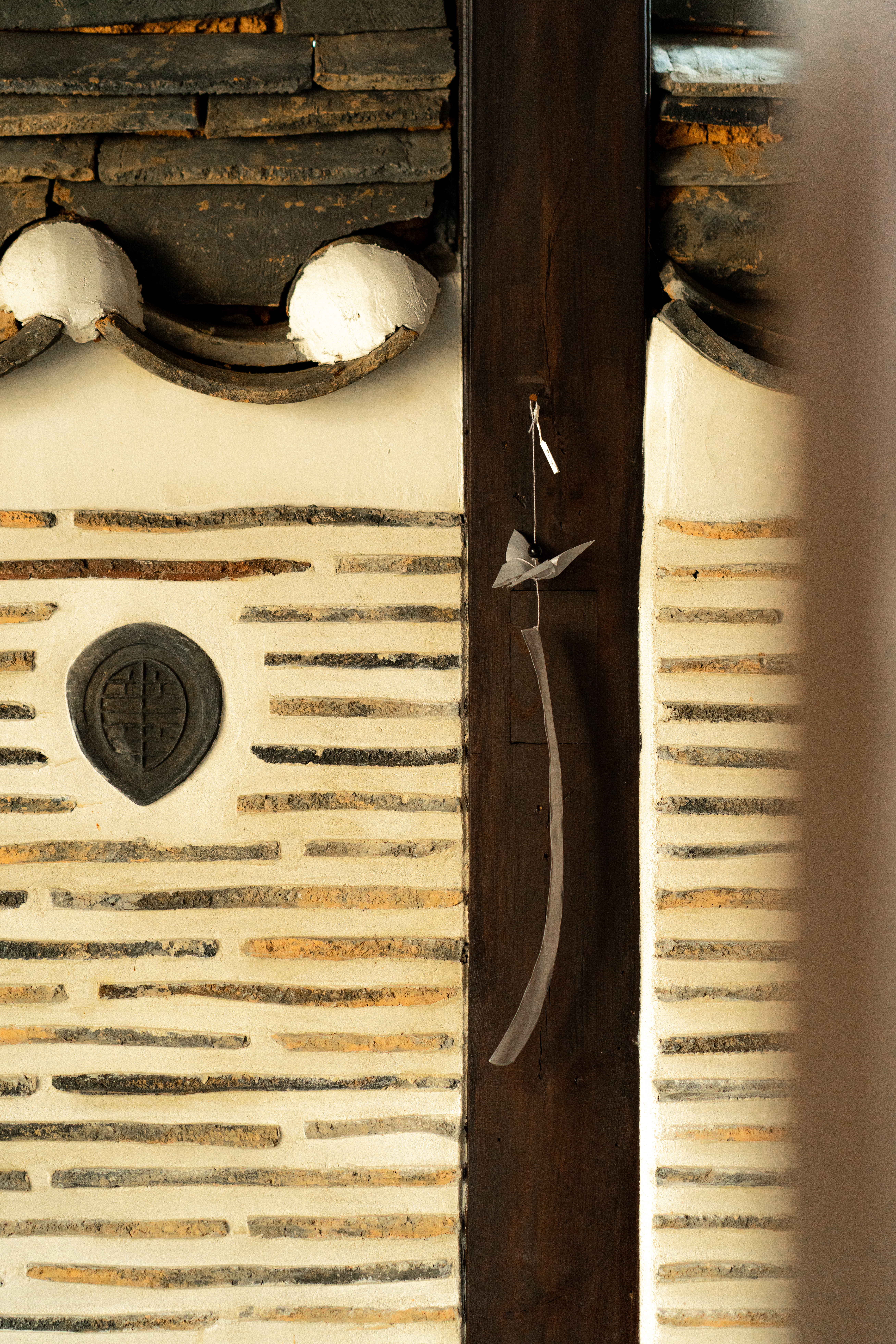 나비가 날아다니면 행운이 생길 것 같은 작은 기쁨이 주위에 일렁입니다. 그런 소망을 염원하며 한지로 나비를 접고, 반투명한 옥사를 늘어뜨려 긴 꼬리를 만들었습니다.
