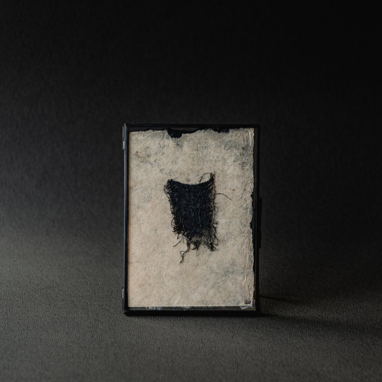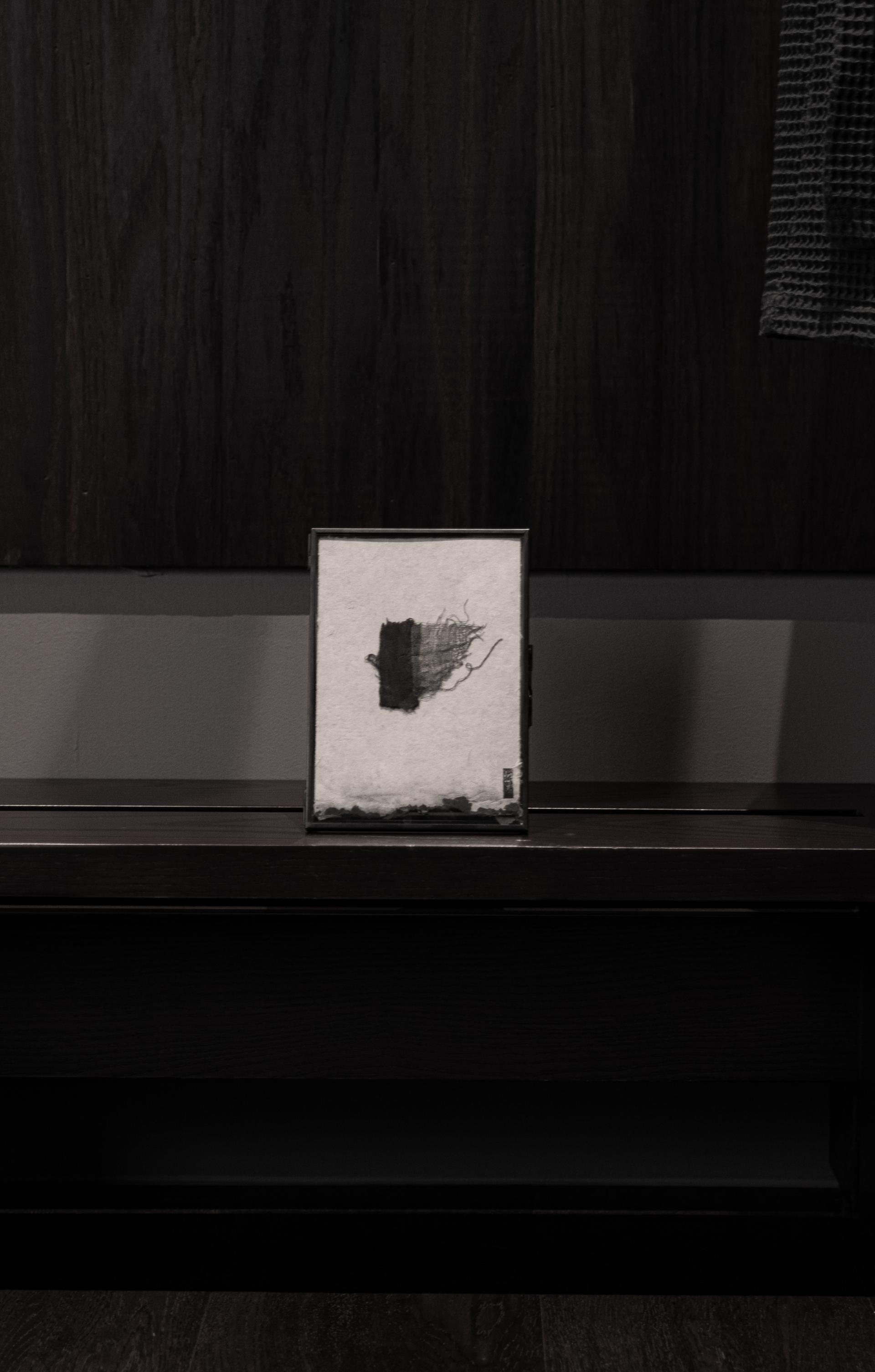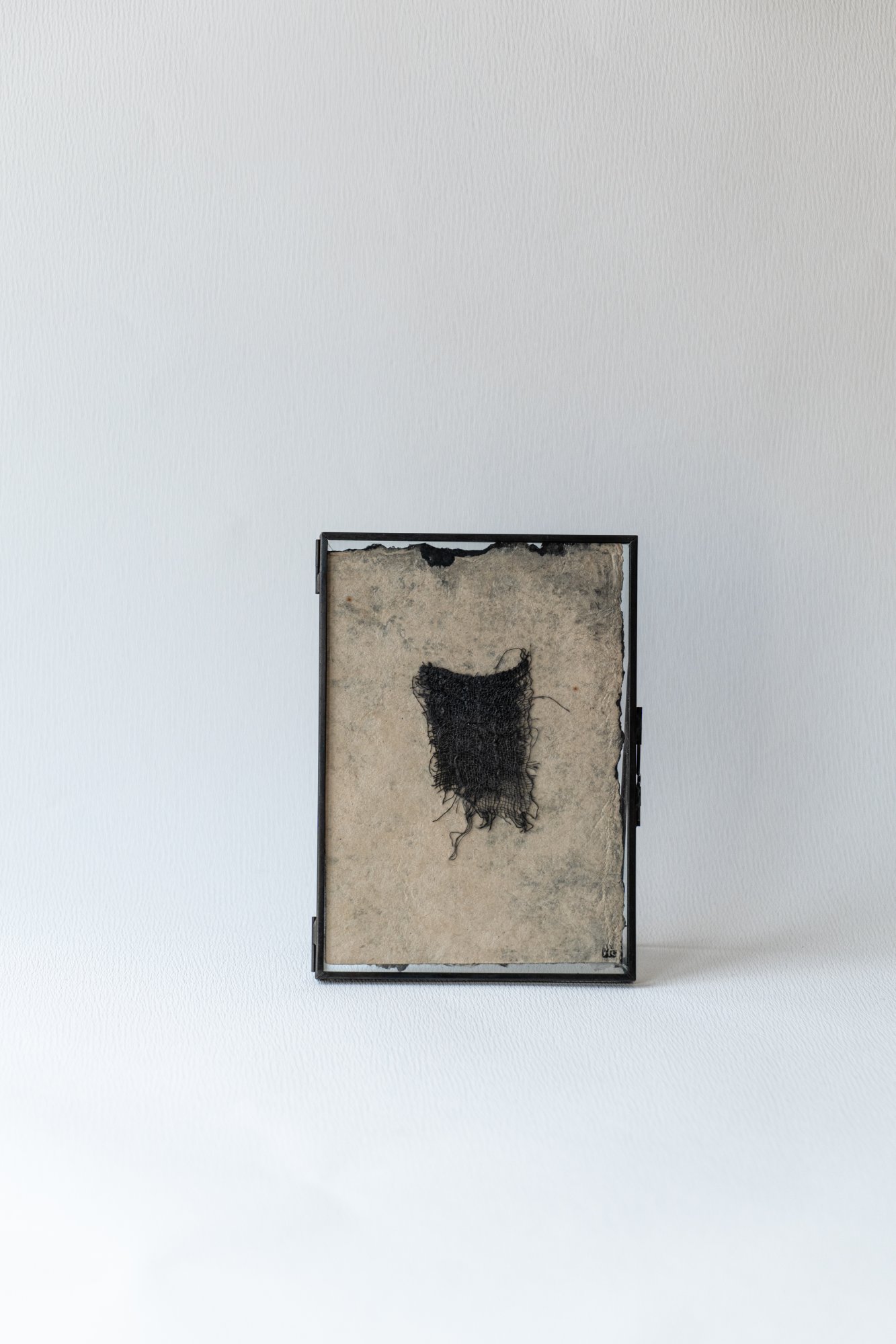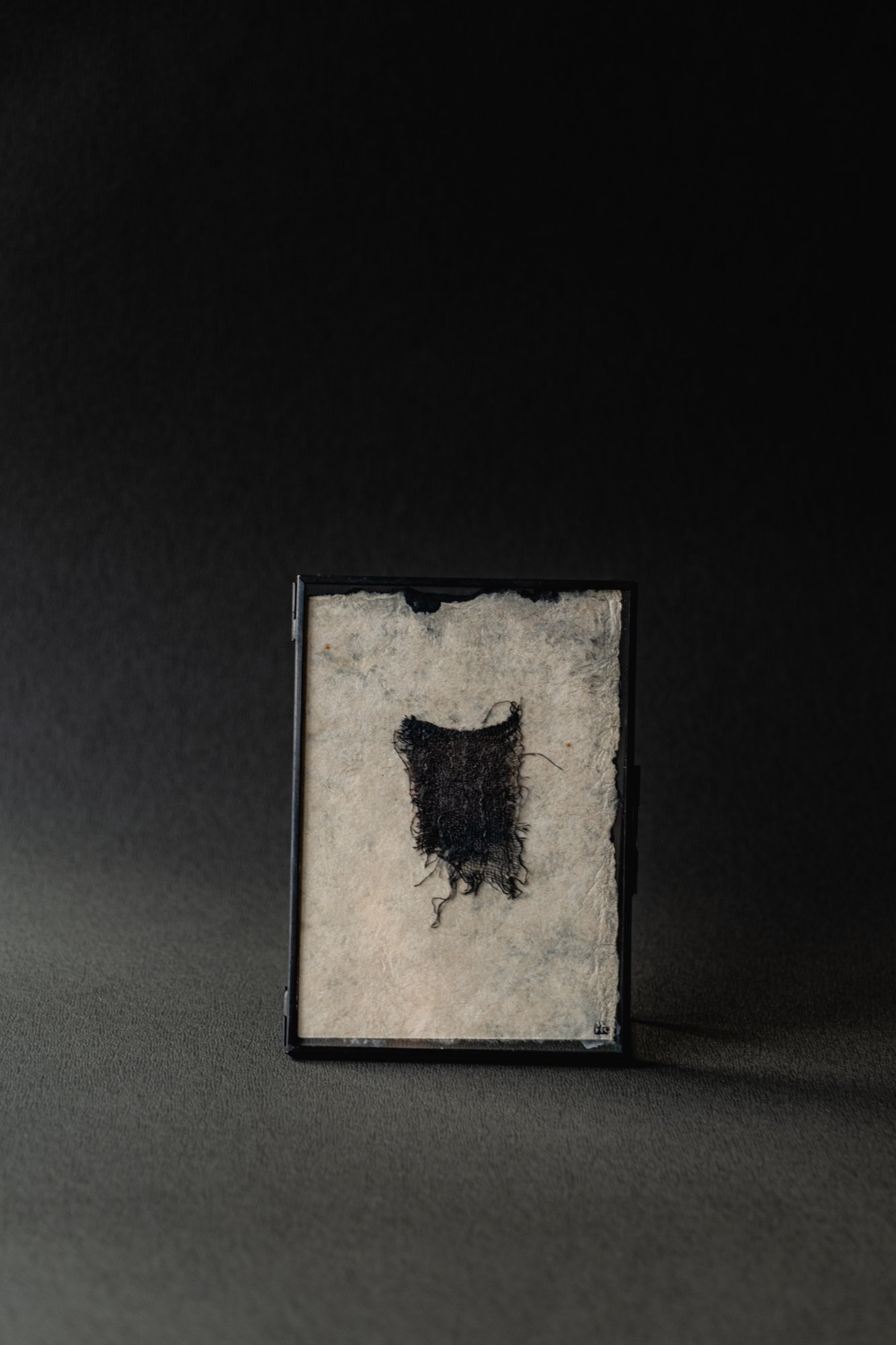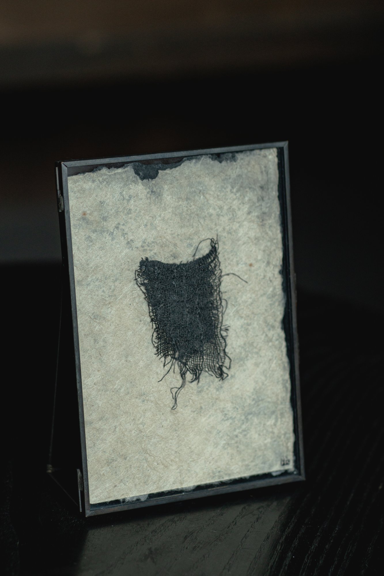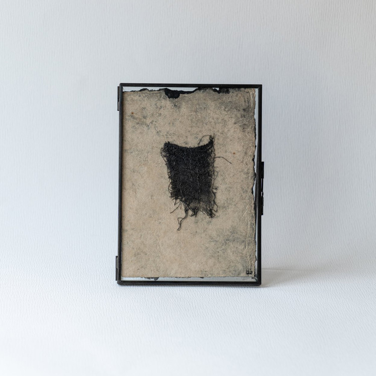 청동 프레임의 유리 액자에 먹염 천 조각을 넣은 작품입니다.