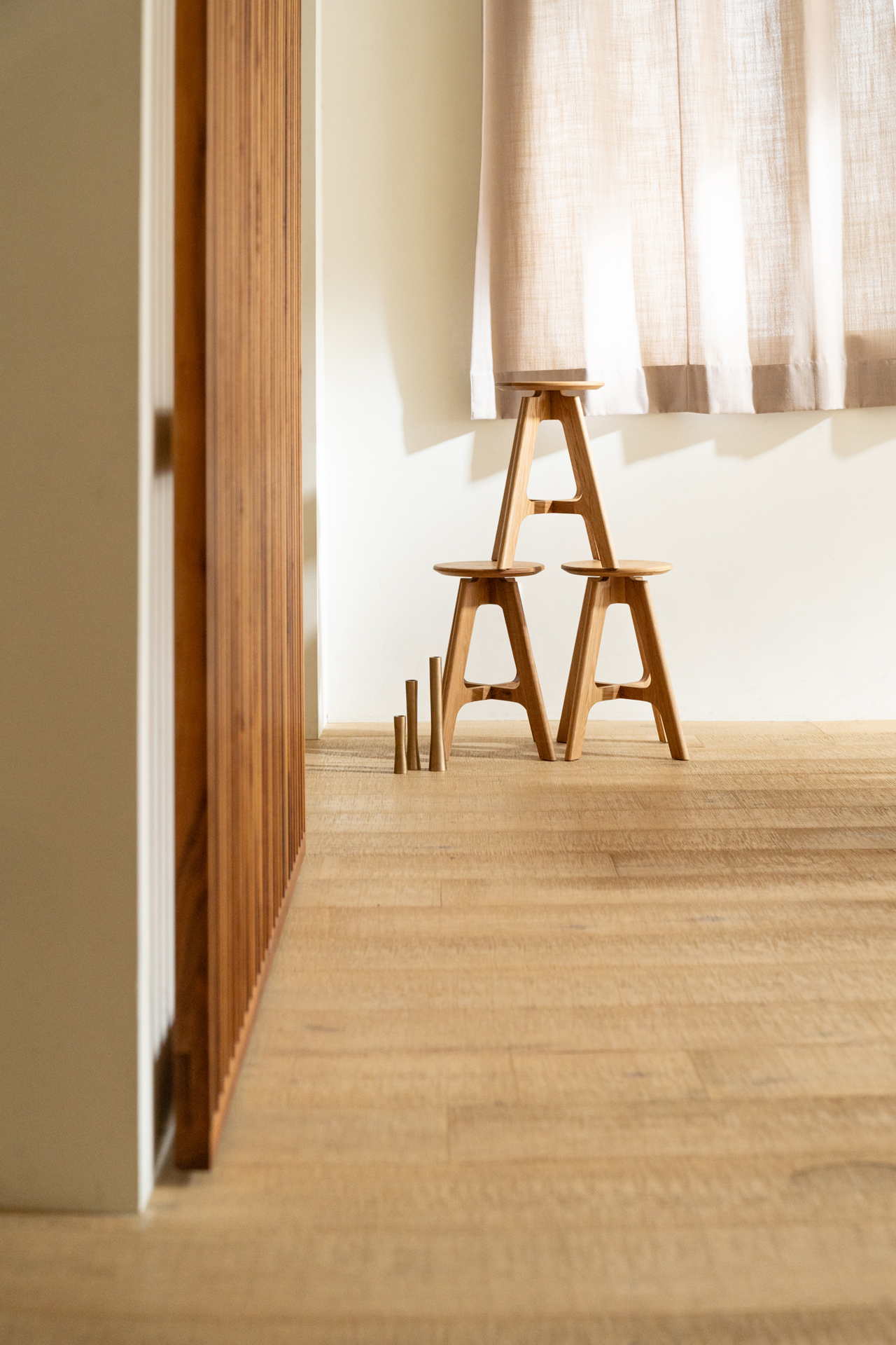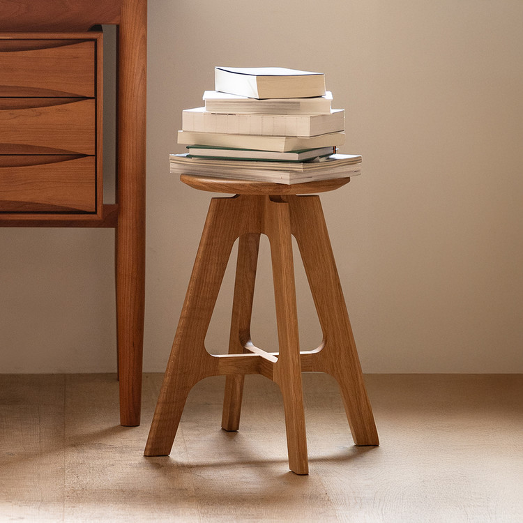 얇은 다리와 숨은 곡선 디테일이 특징이며, 십자형 하부 구조로 안정감을 더했습니다. 스툴 외로도 소파나 침대 옆에 두고 잠시 커피나 책을 올려 두기에도 유용합니다.