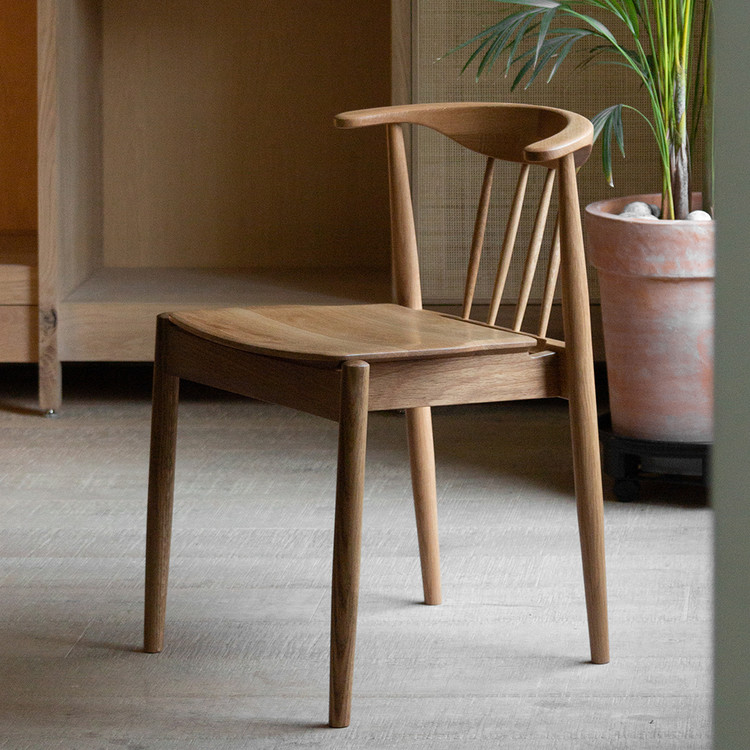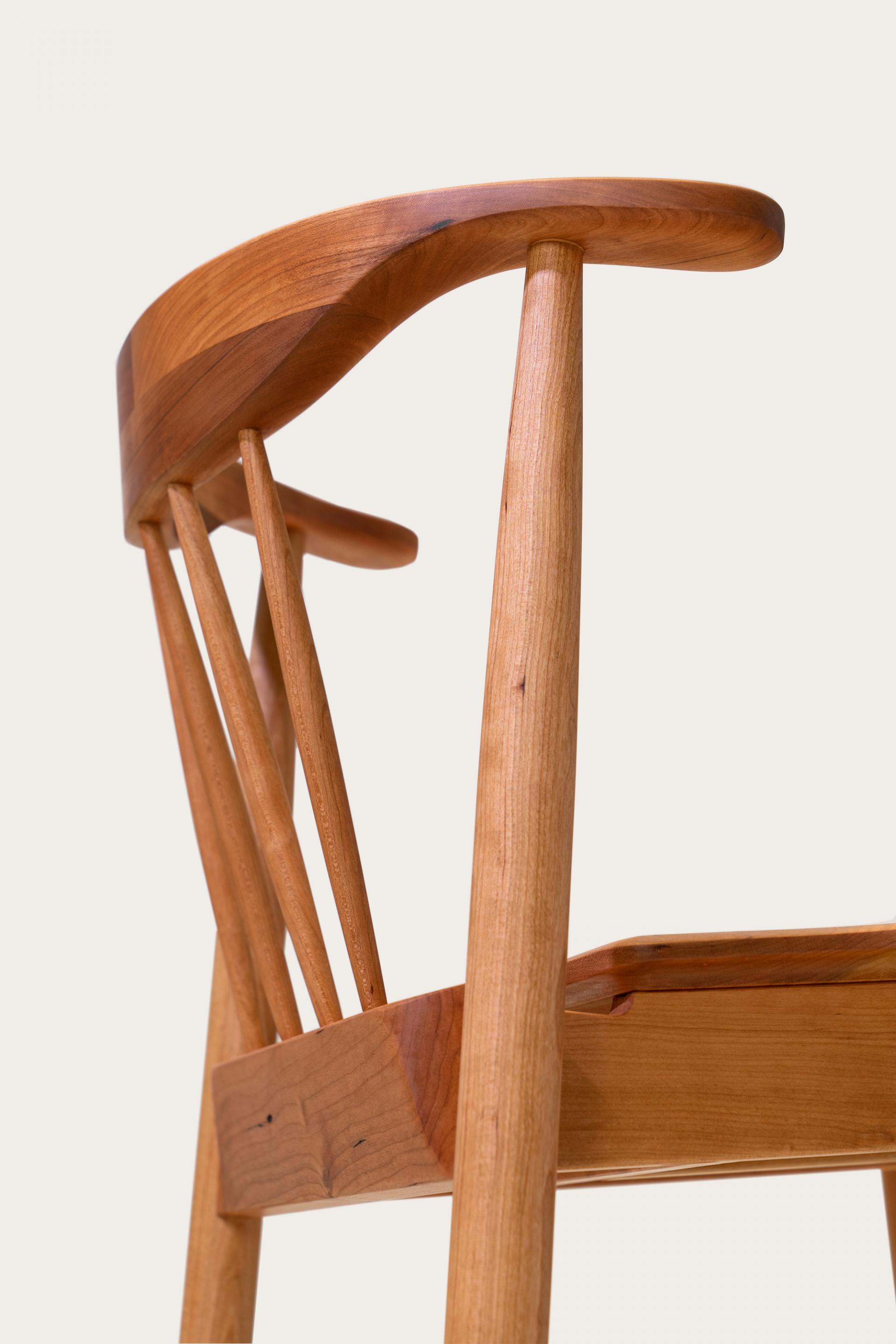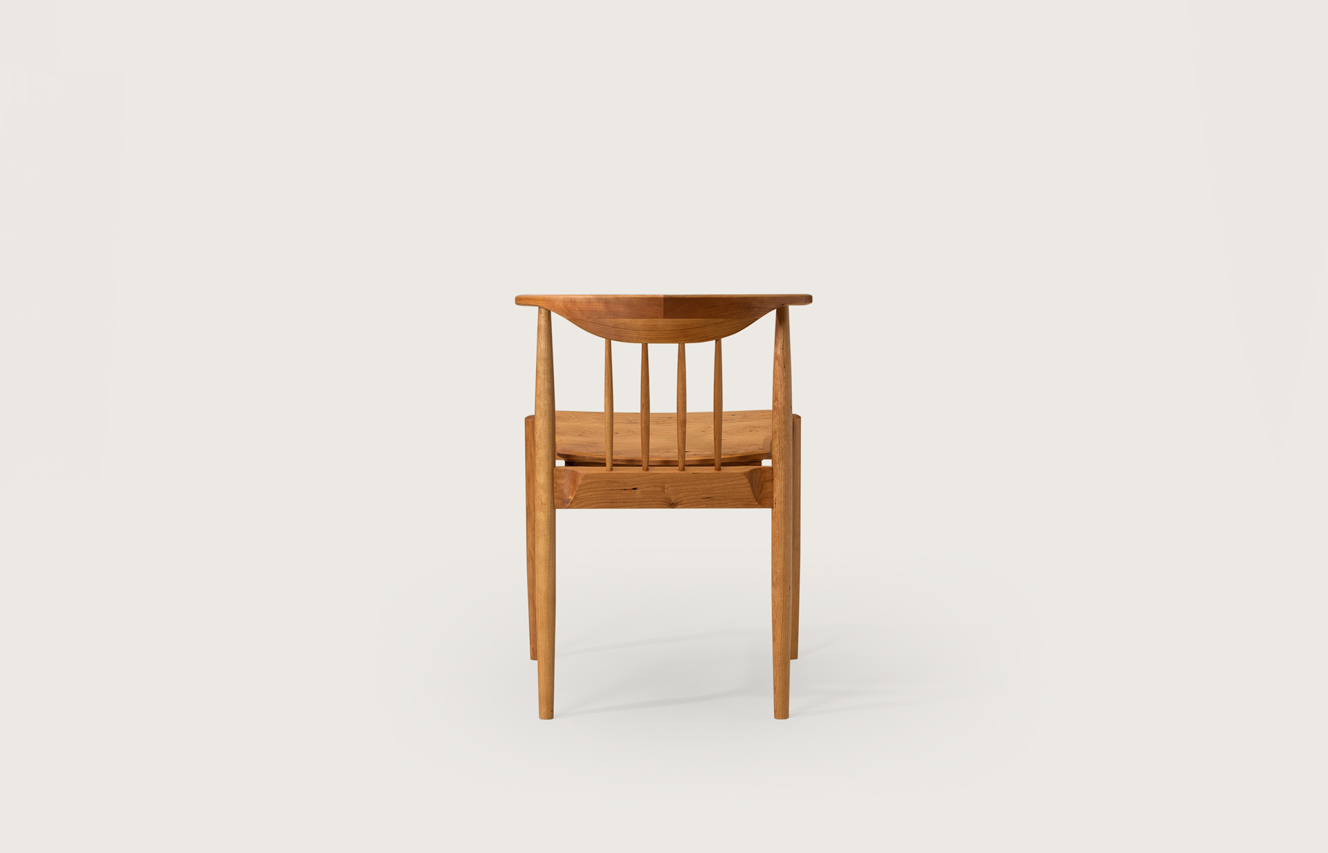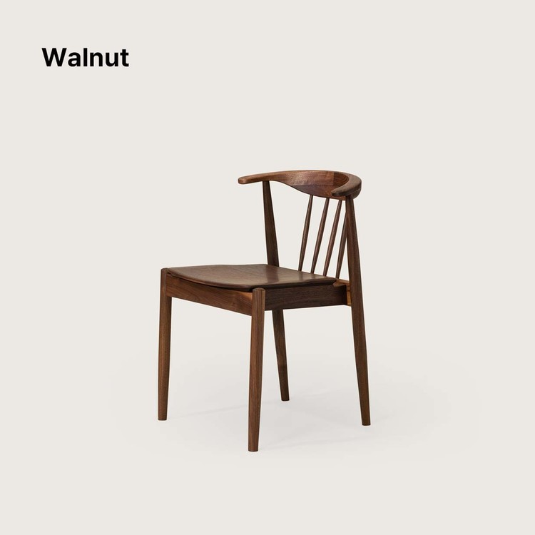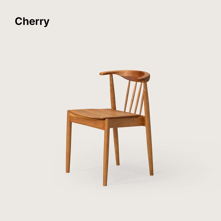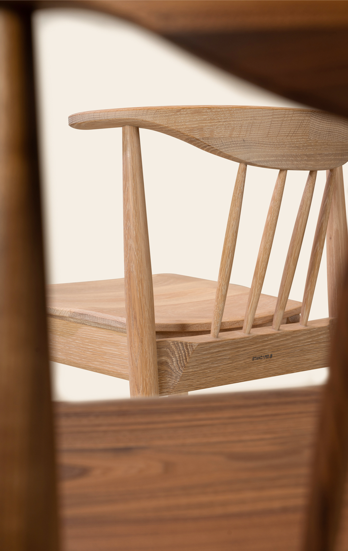 암레스트 끝까지 곡면으로 둥글게 다듬은 등판. 등판을 지지하는 네 개의 얇은 목봉. 목봉과 뒷다리를 연결하는 입체적인 에이프런.