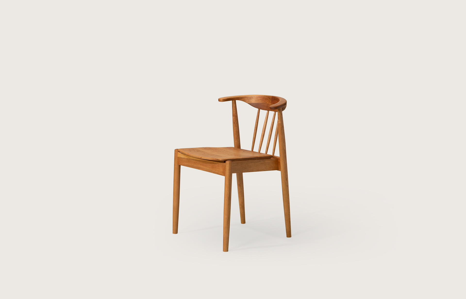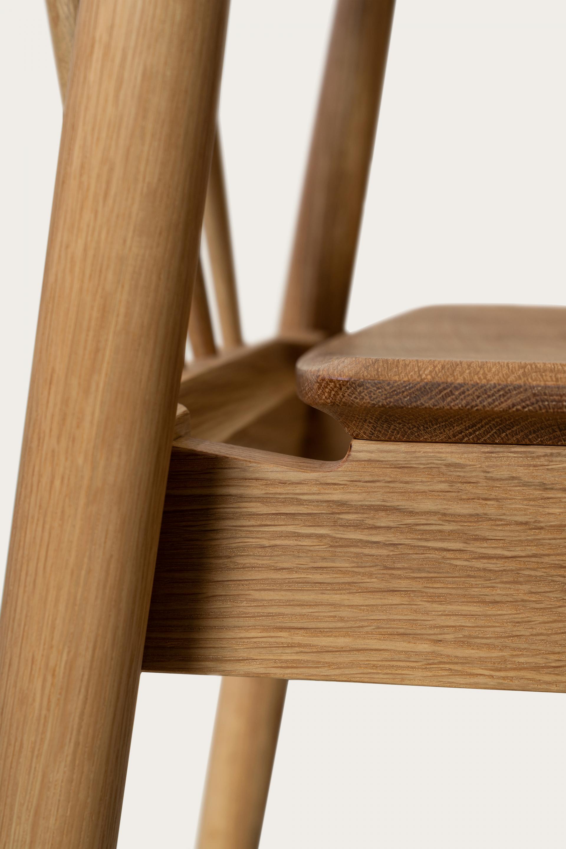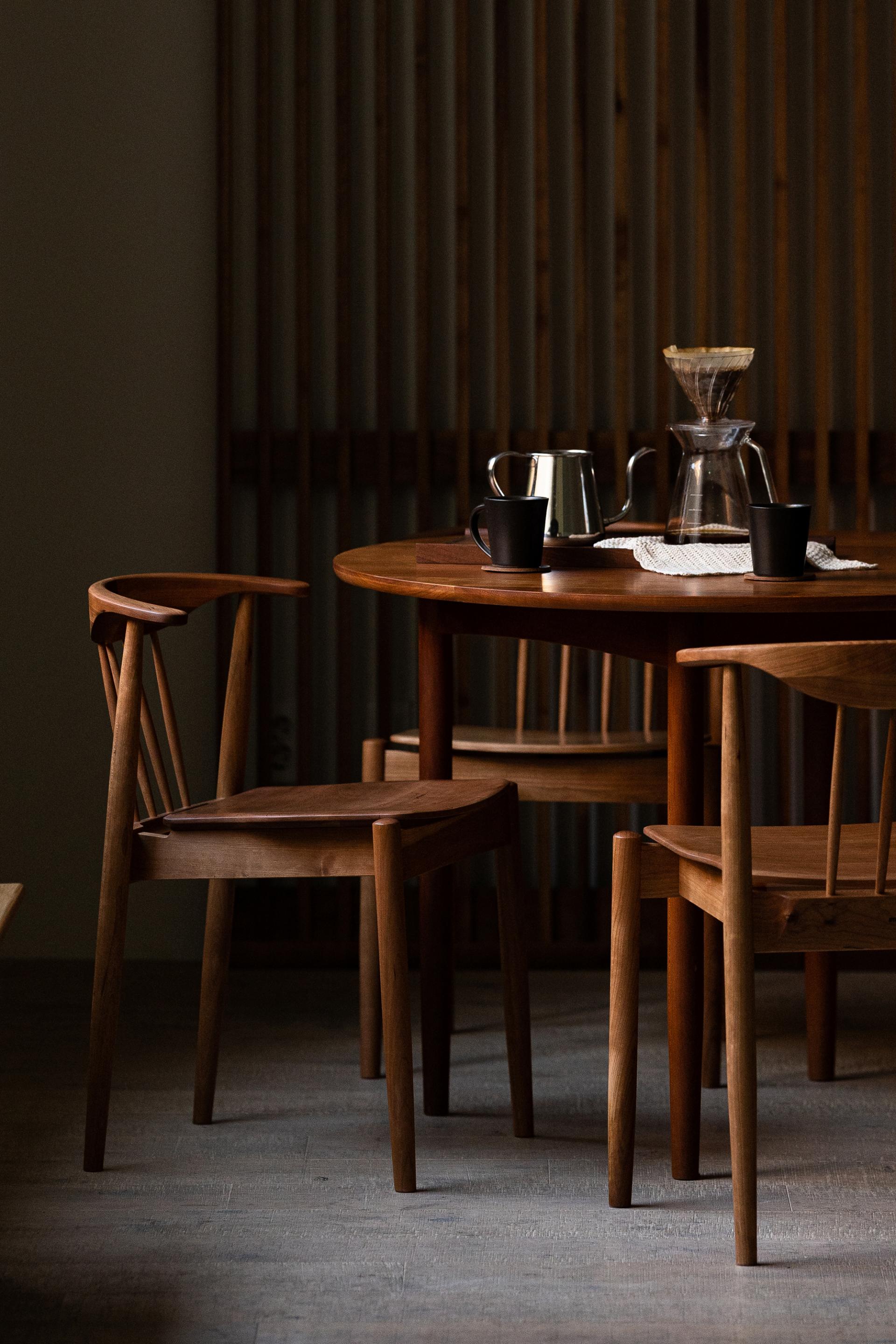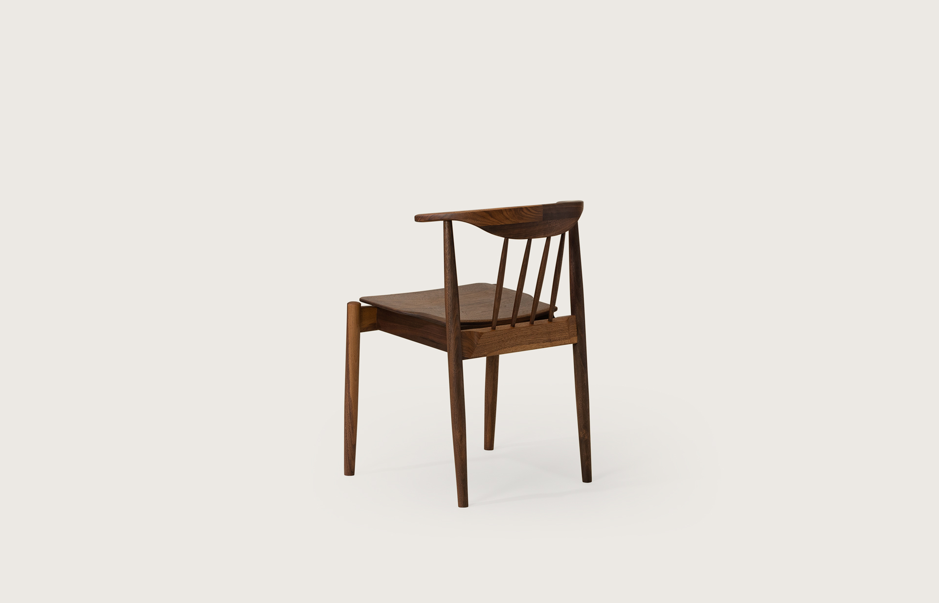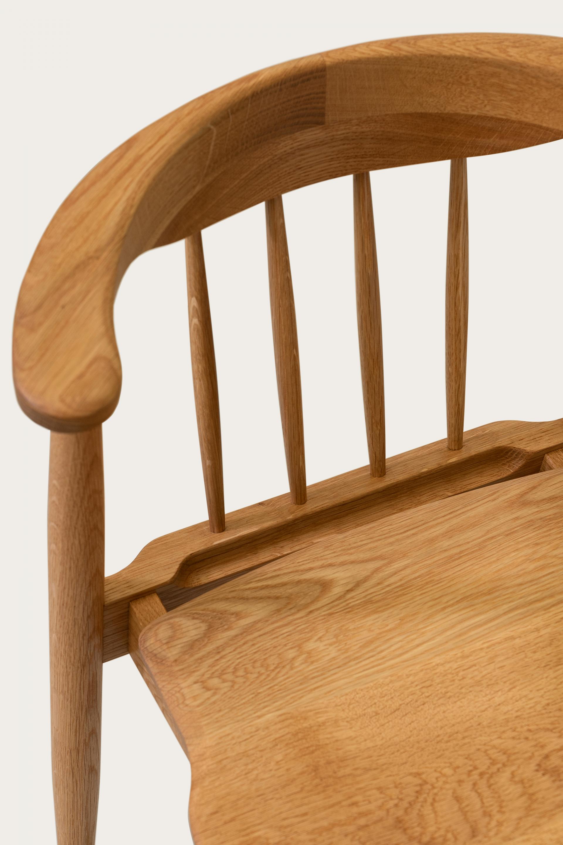 암레스트 끝까지 곡면으로 둥글게 다듬은 등판. 등판을 지지하는 네 개의 얇은 목봉. 목봉과 뒷다리를 연결하는 입체적인 에이프런.