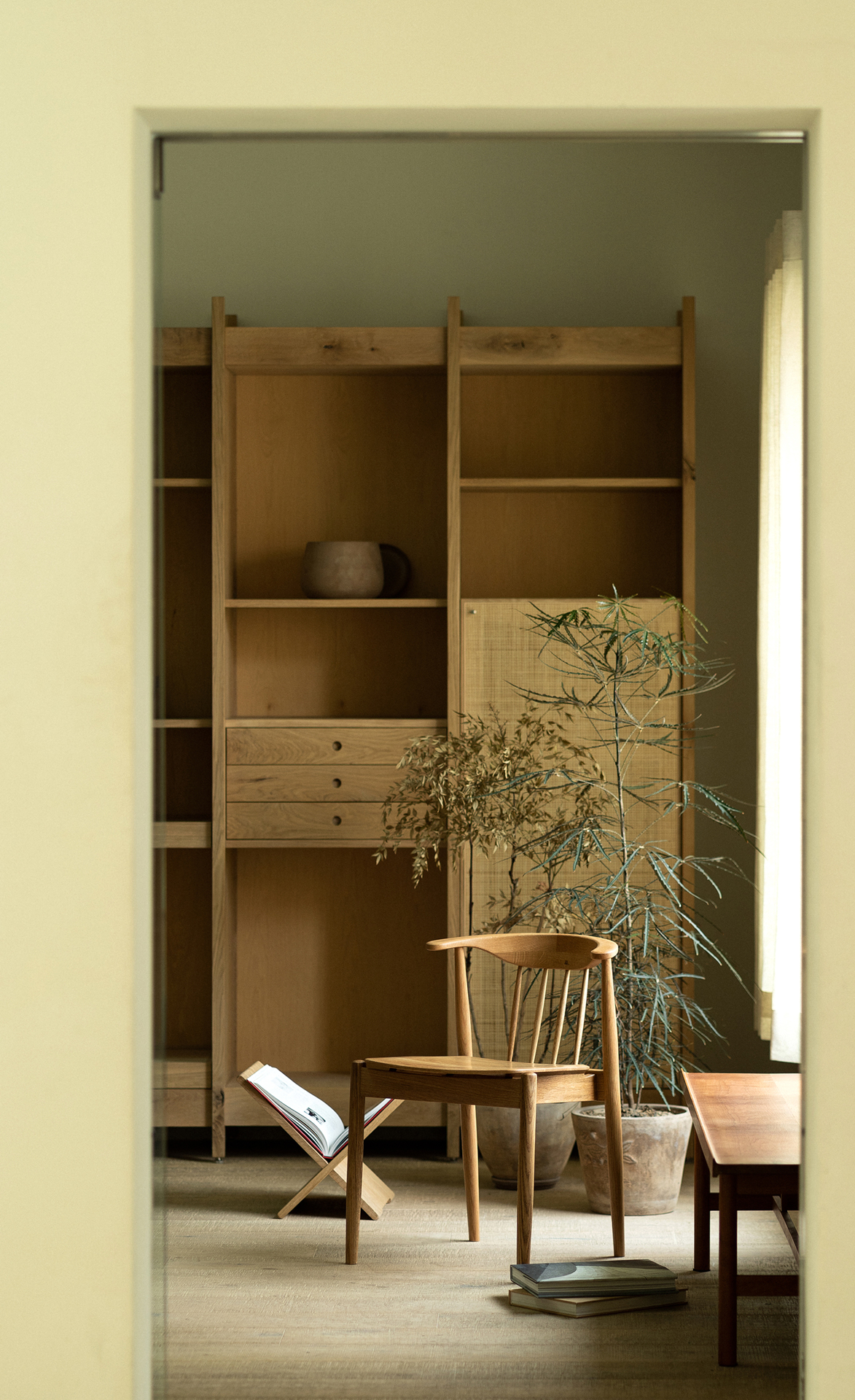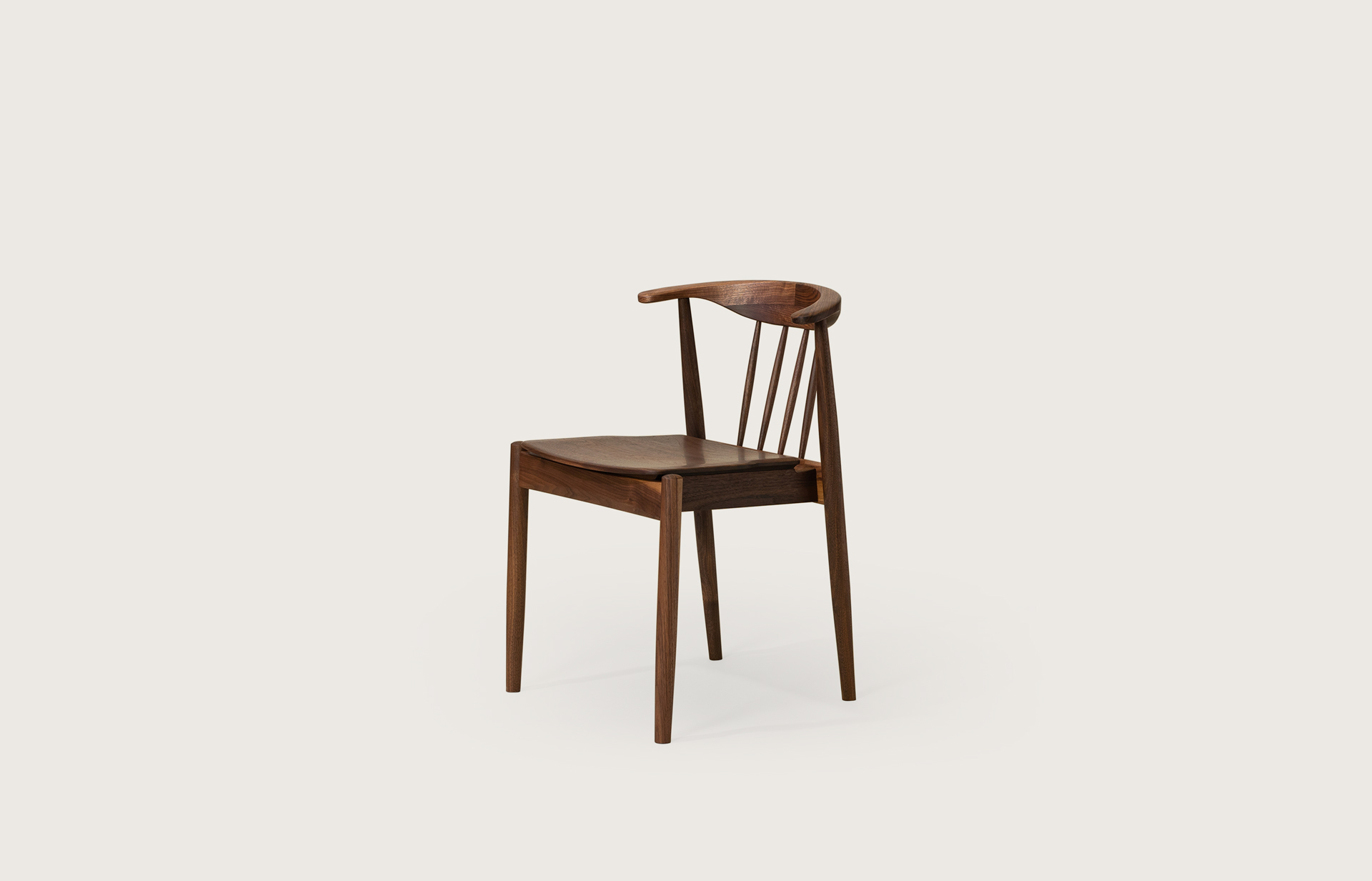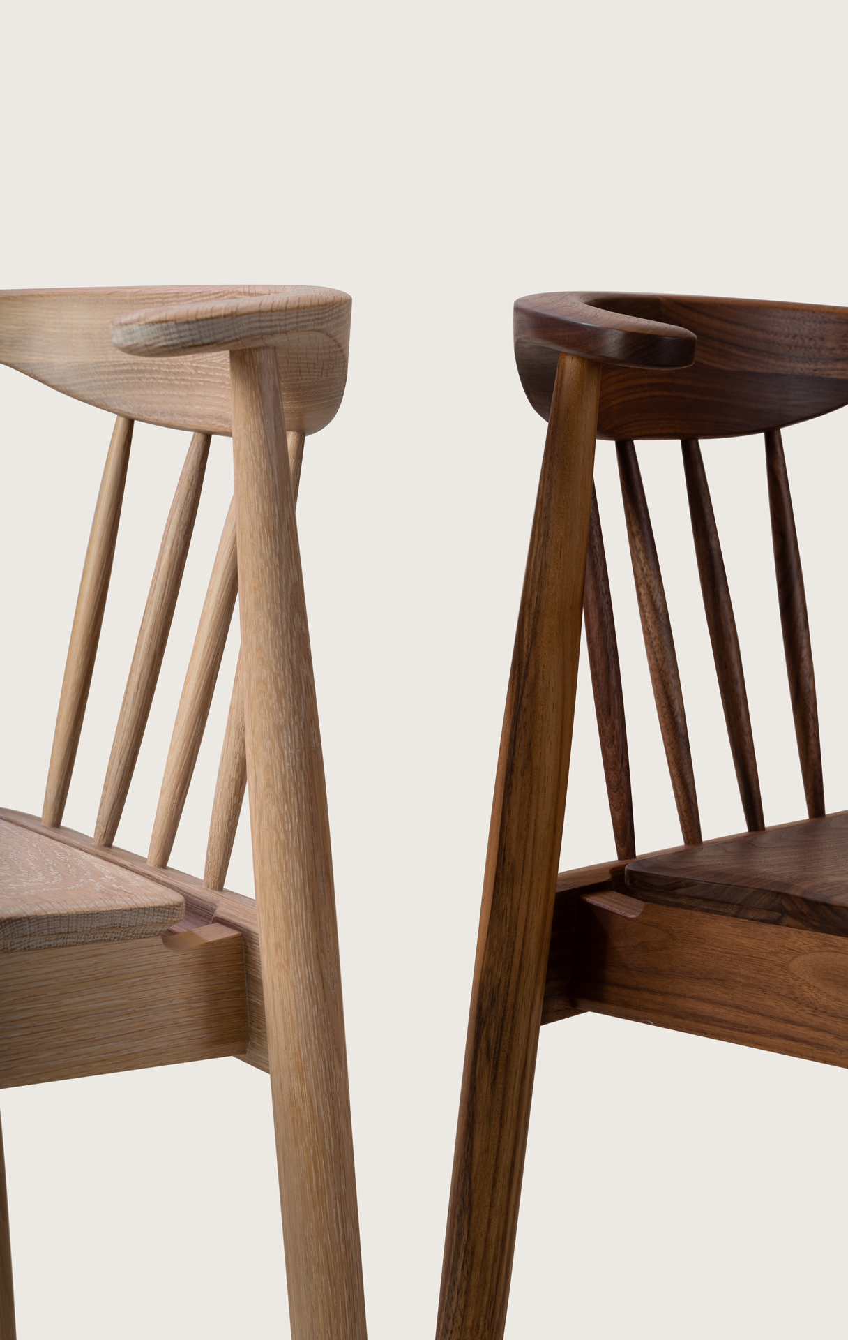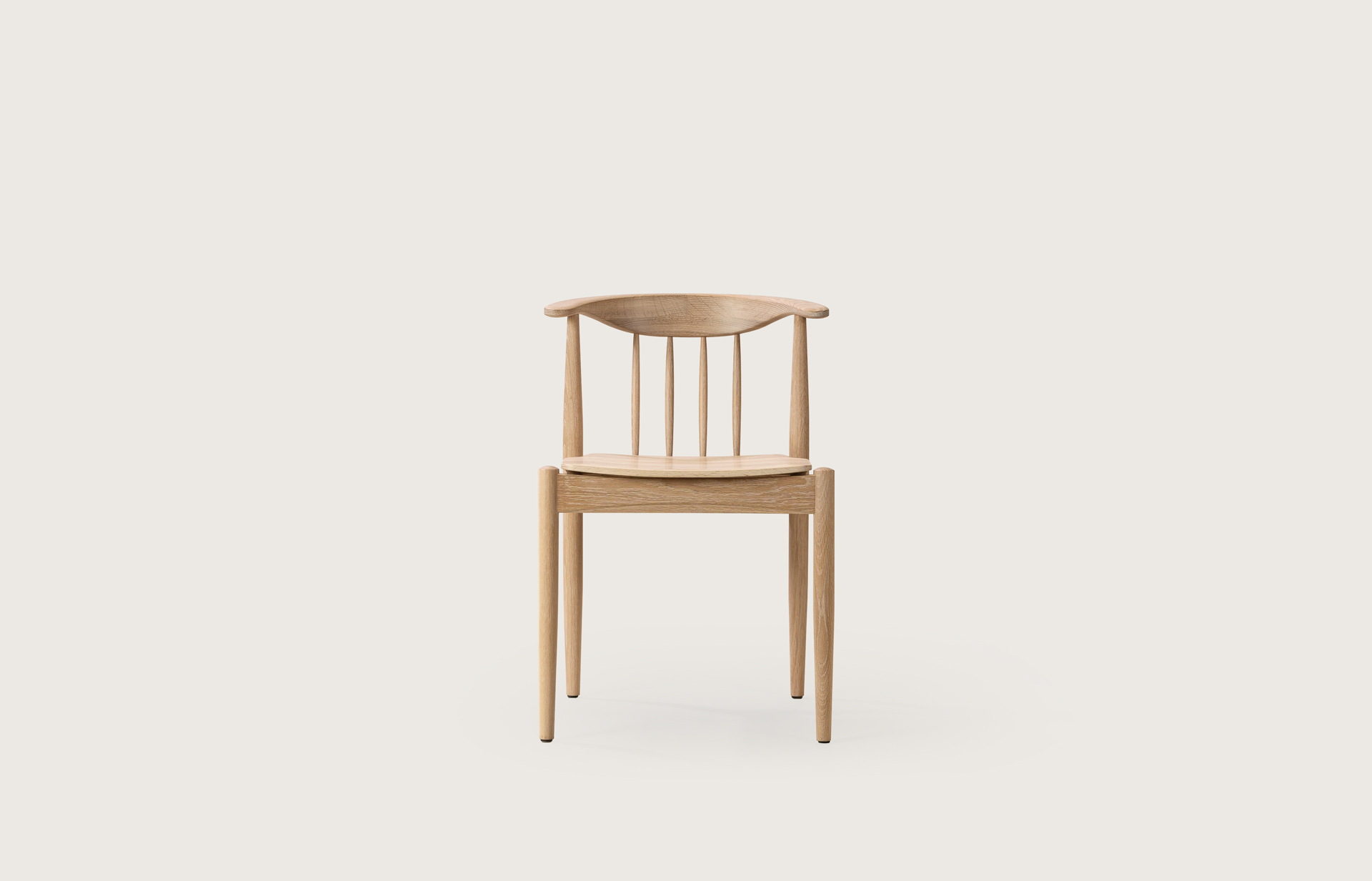 암레스트 끝까지 곡면으로 둥글게 다듬은 등판. 등판을 지지하는 네 개의 얇은 목봉. 목봉과 뒷다리를 연결하는 입체적인 에이프런.