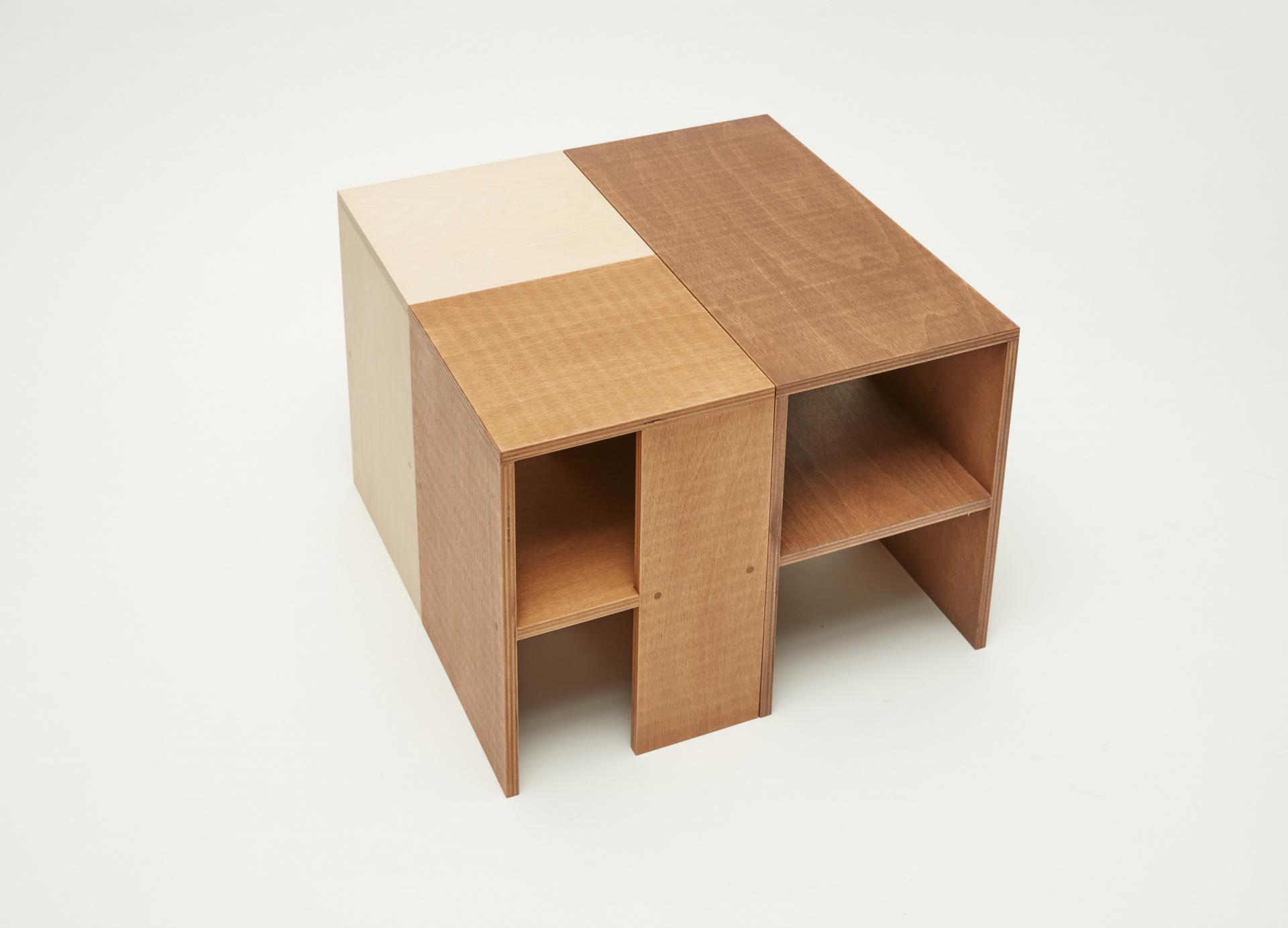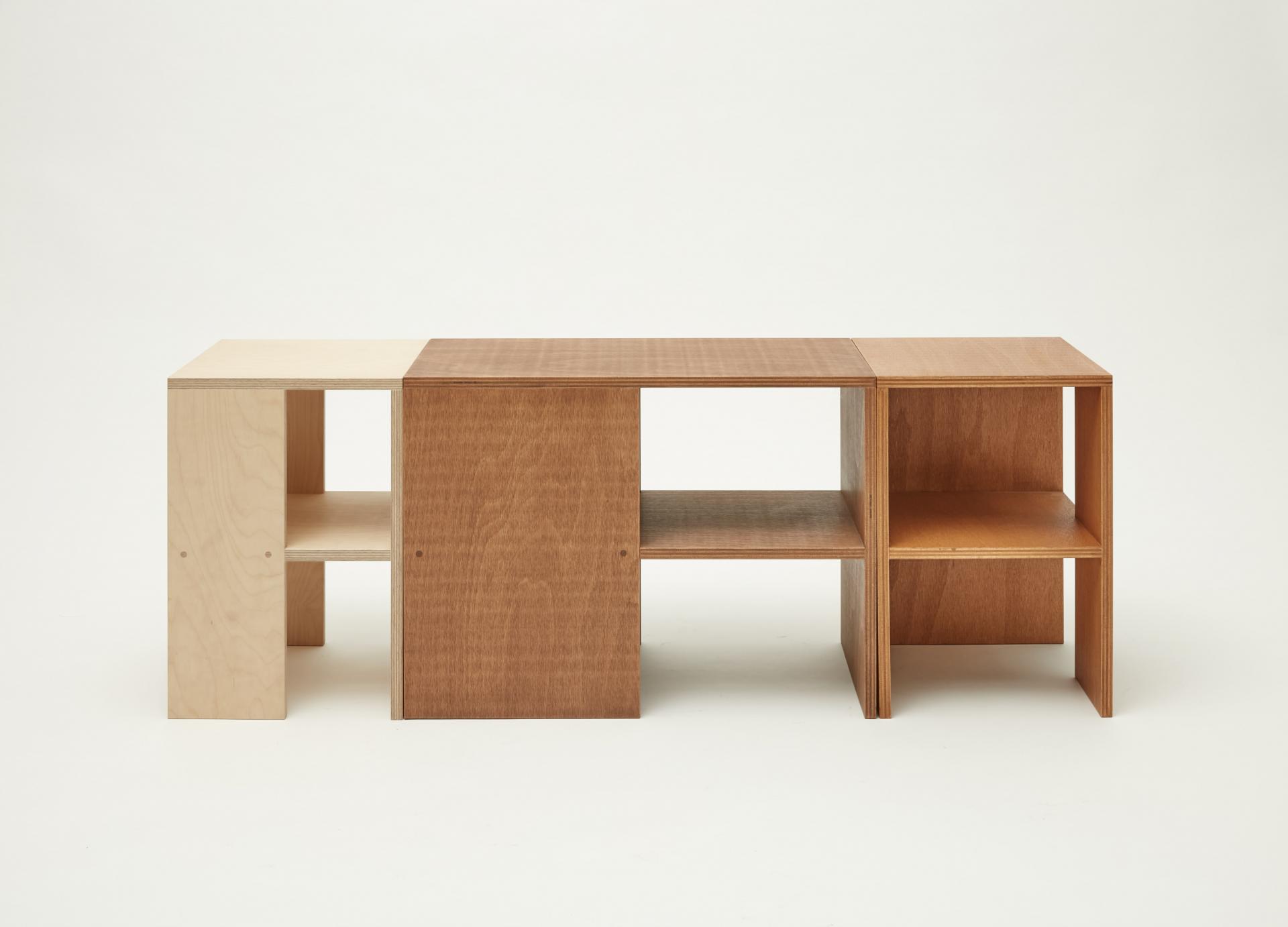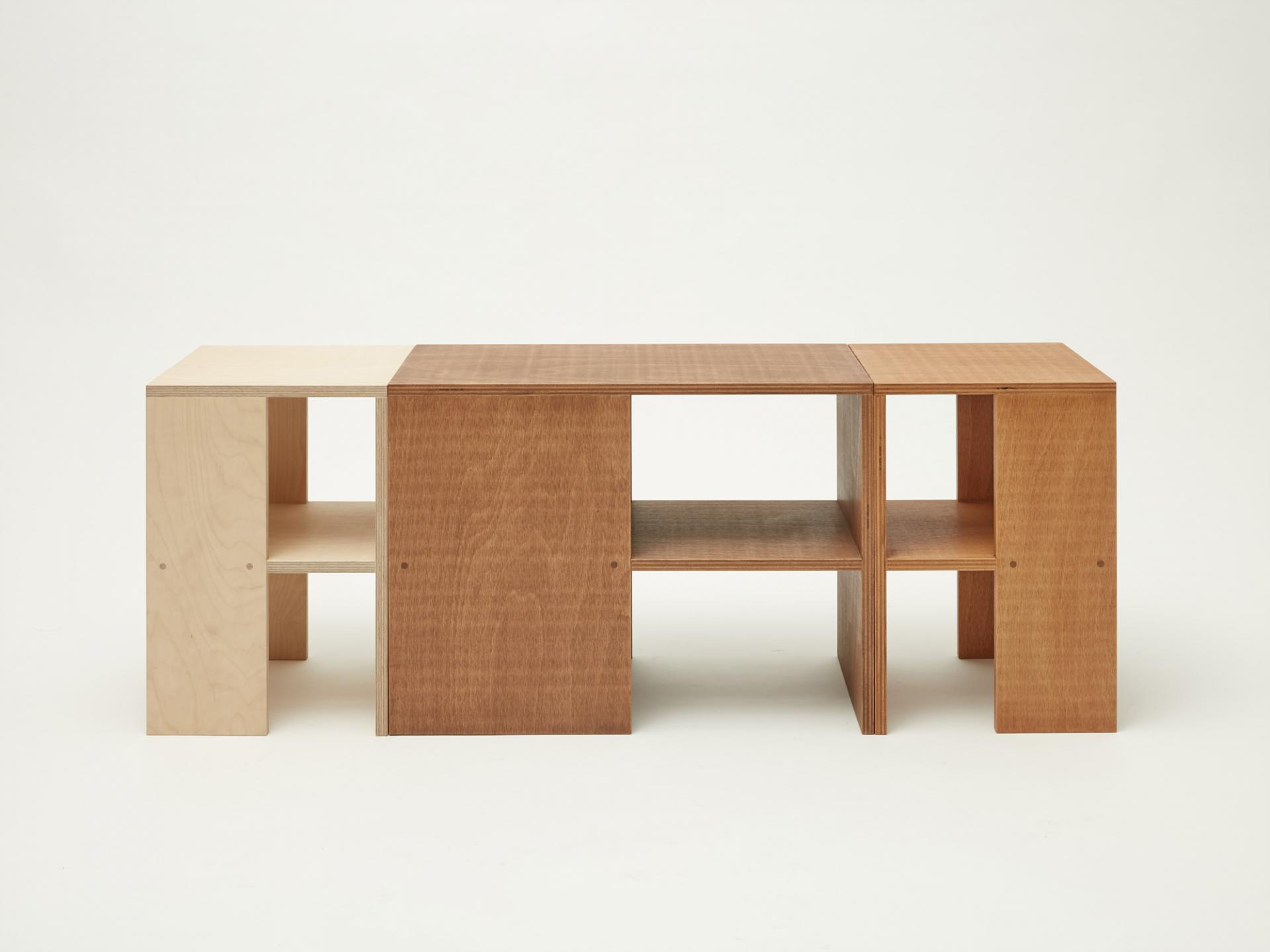 퍼즐처럼 맞춰 테이블로 사용할 수 있는 너도밤나무 합판으로 만든 스툴입니다. 스툴 위에는 소품을 디스플레이할 수 있고 사이 공간에는 책을 수납할 수도 있습니다.
