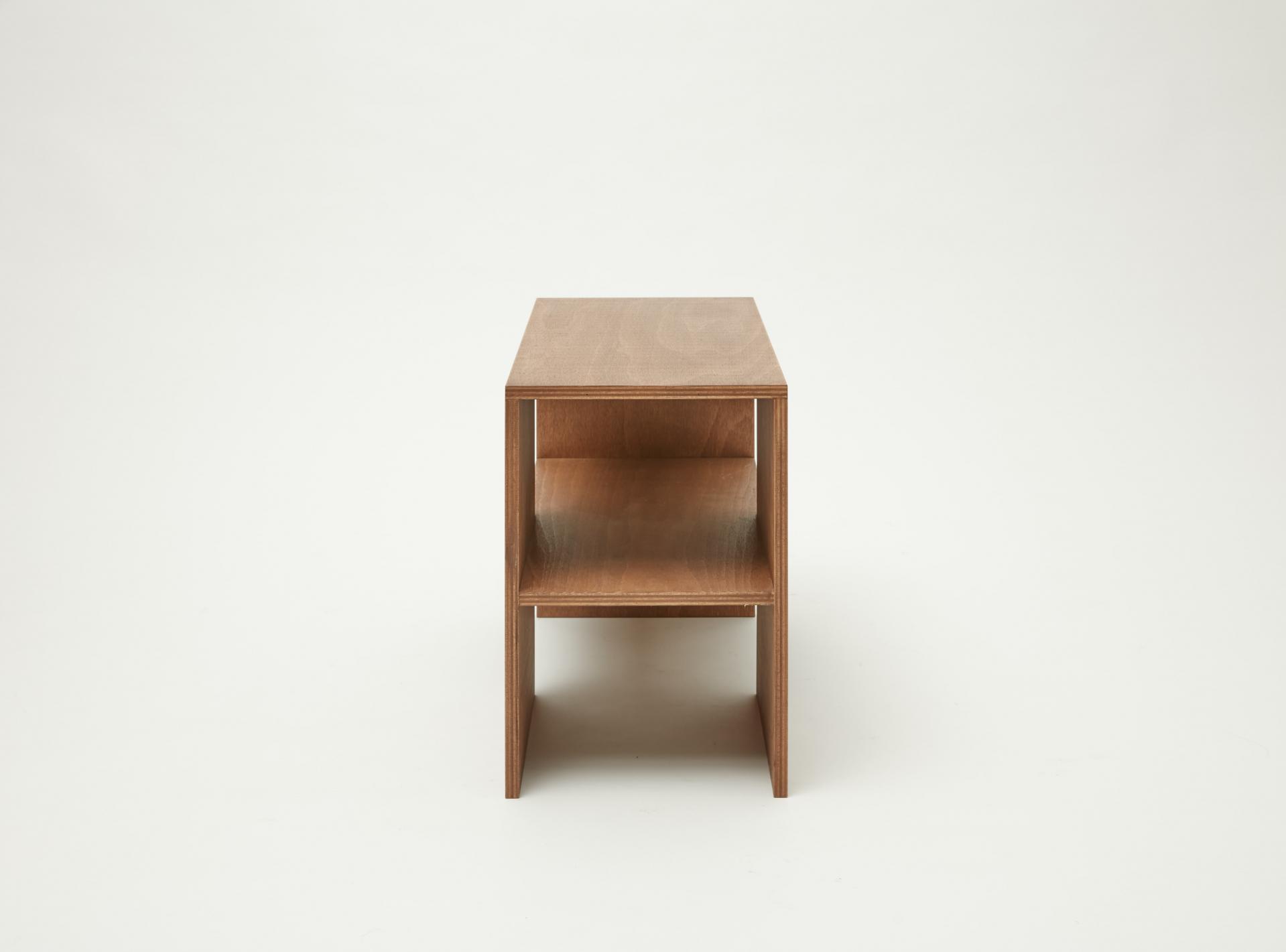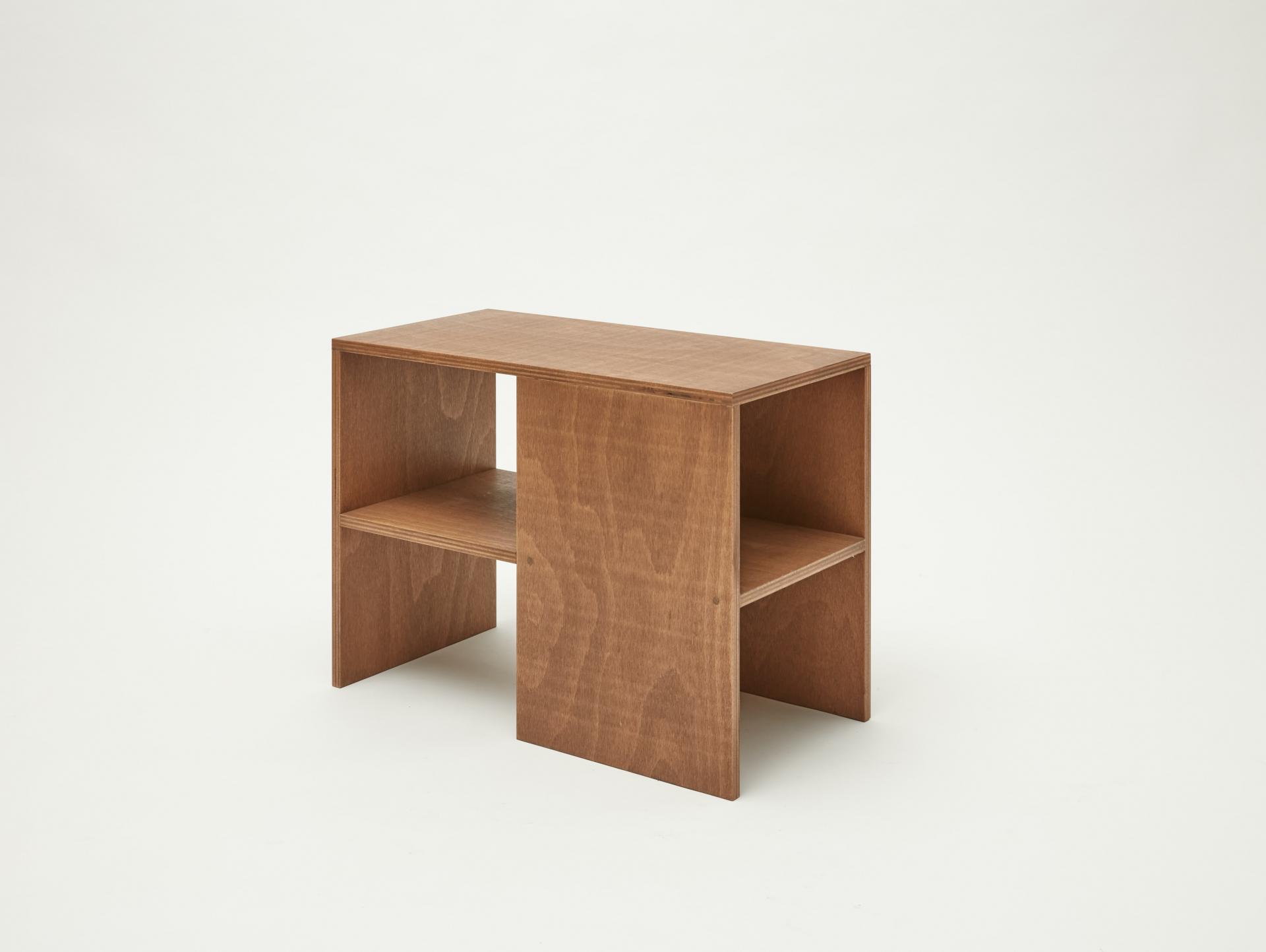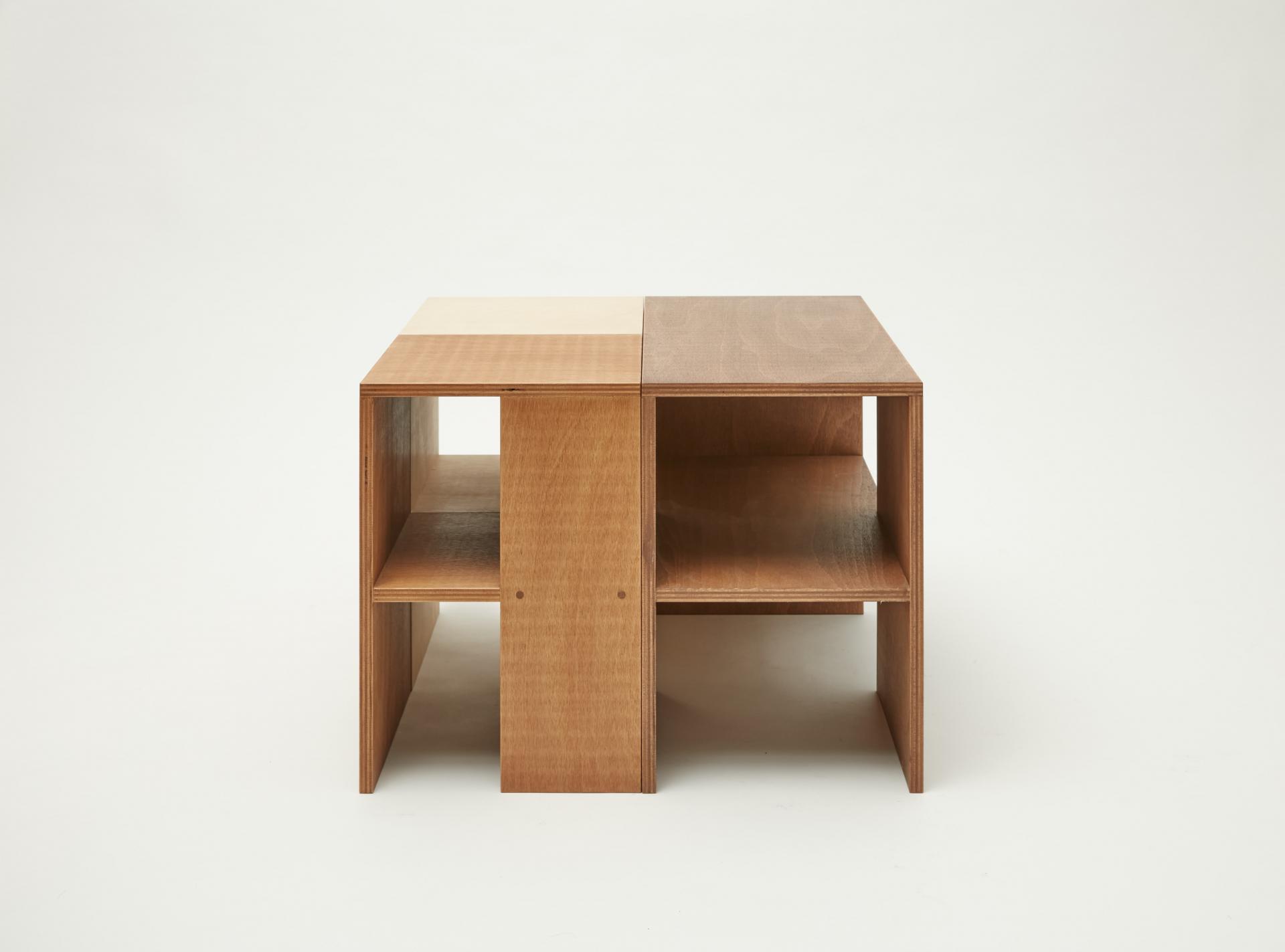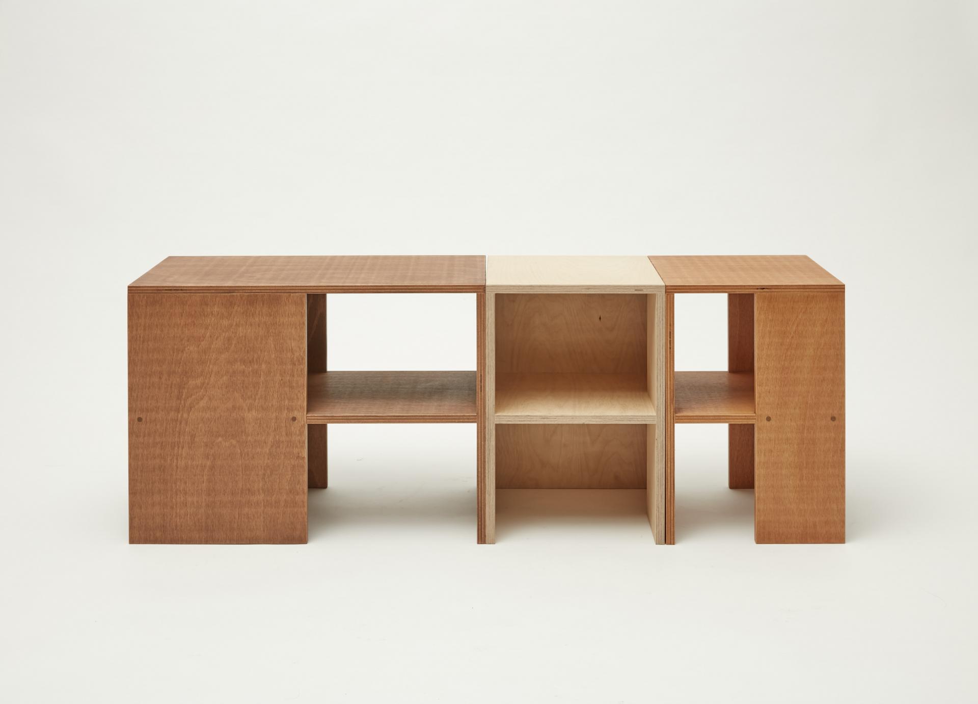 퍼즐처럼 맞춰 테이블로 사용할 수 있는 너도밤나무 합판으로 만든 스툴입니다. 스툴 위에는 소품을 디스플레이할 수 있고 사이 공간에는 책을 수납할 수도 있습니다.