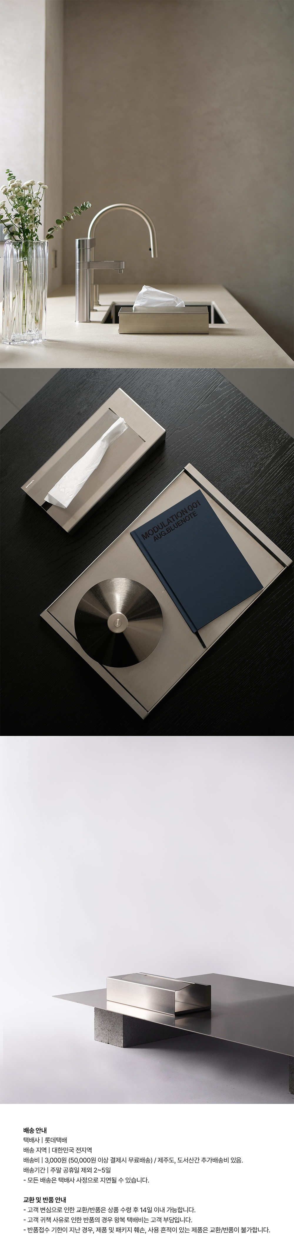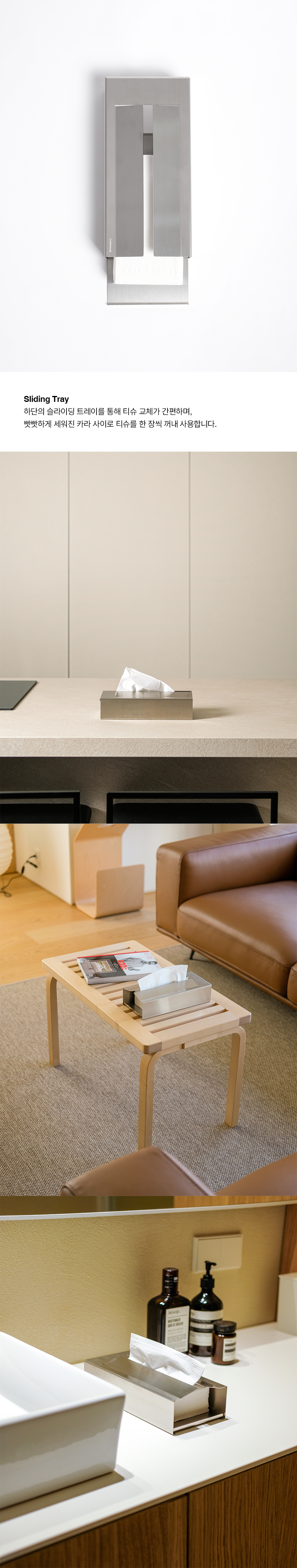 티슈를 간편하게 교체할 수 있는 하단 슬라이딩 트레이로 사용의 편리함을 더했으며, 손끝에 닿는 정갈한 질감과 조형적인 면의 구성이 공간에 차분한 정돈감을 선사합니다.