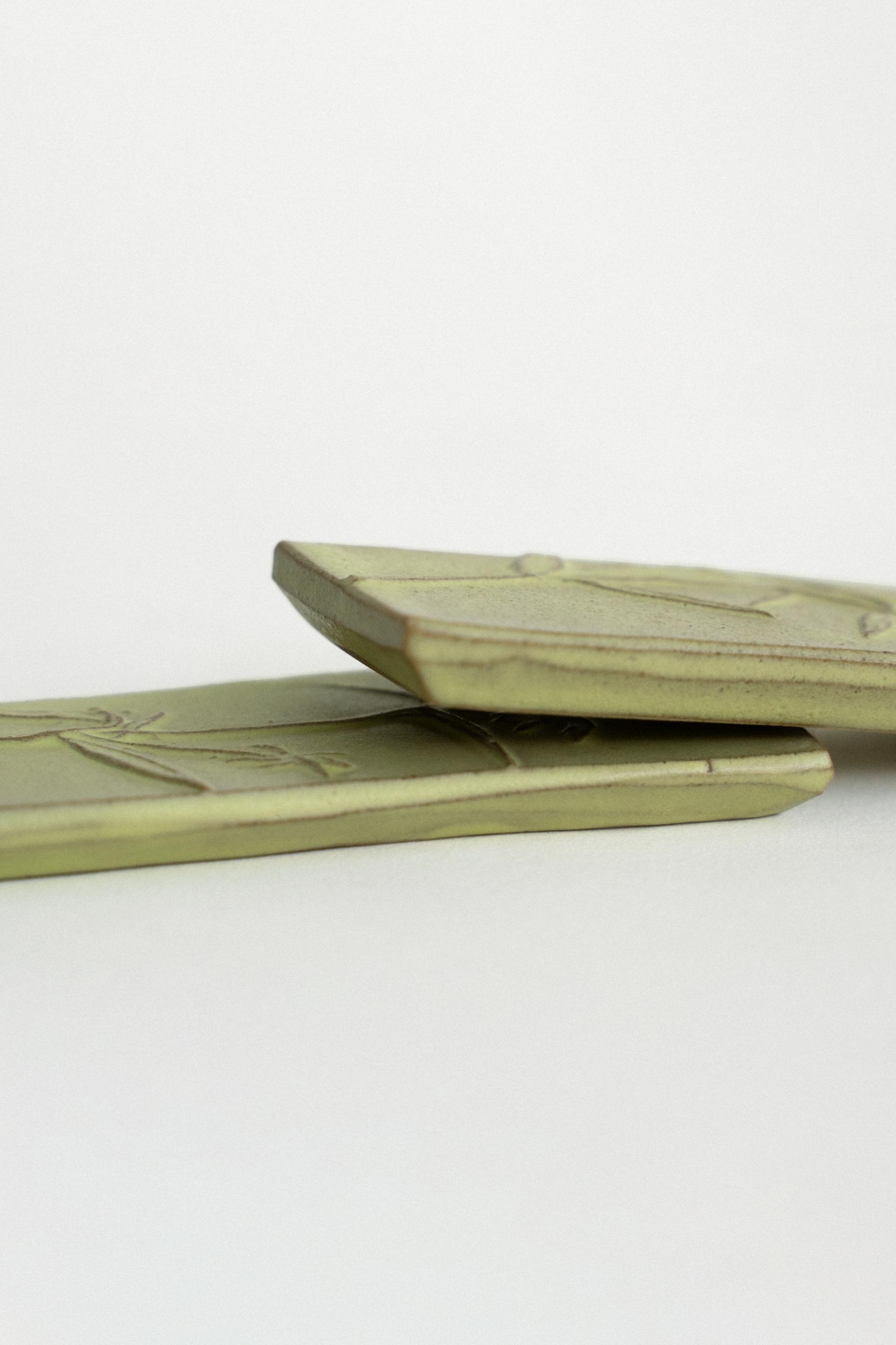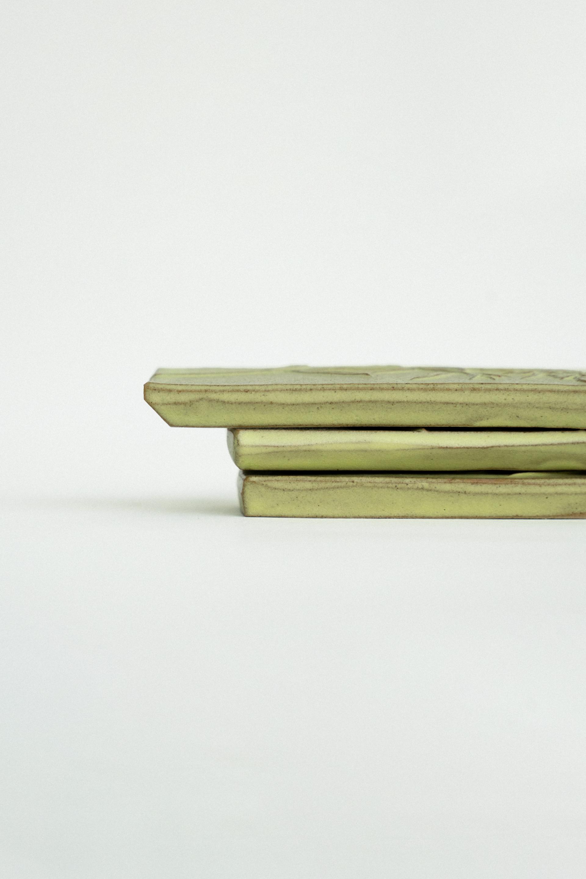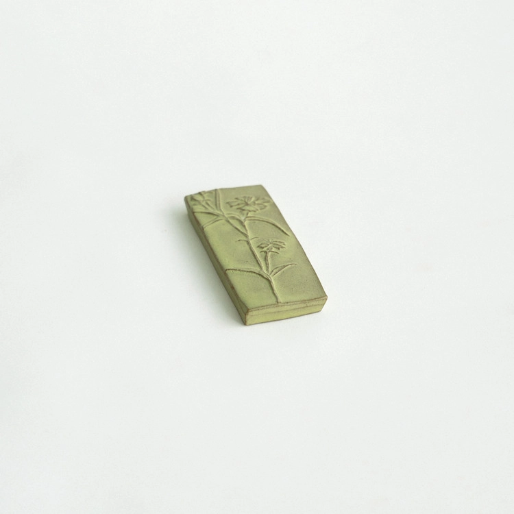 패랭이꽃이 조각된 연두색 문진입니다. 납작하고 긴 형태로 문진, 수저받침 등으로 활용할 수 있습니다.